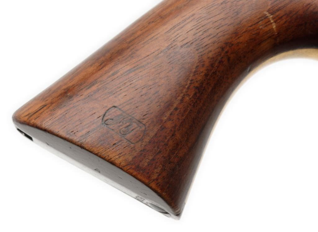 Colt 1860 Army pistol U.S. Martial marked and cartouche, S/N 85124 manufactured about 1863 during the Civil War. Lightly cleaned long ago with smooth gray patina finish with sharp markings and edges. The grips show outlines of cartouches and inspectors initials. Sharp barrel address and markings with 40%-60% light cylinder scene. All matching with very good grips. Est.: $1750-$3500