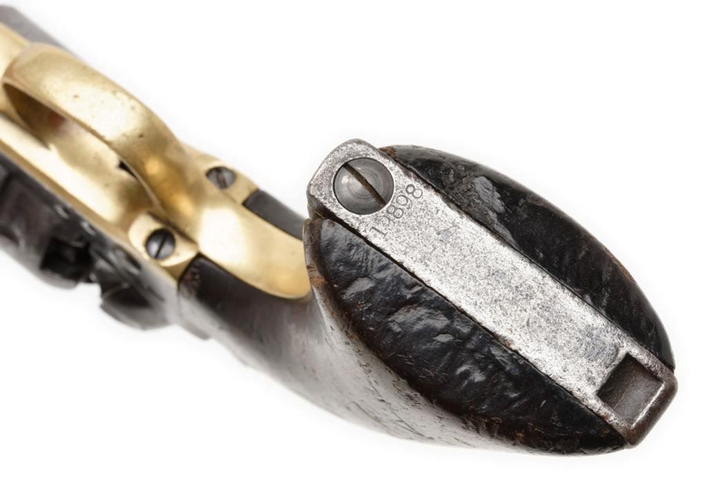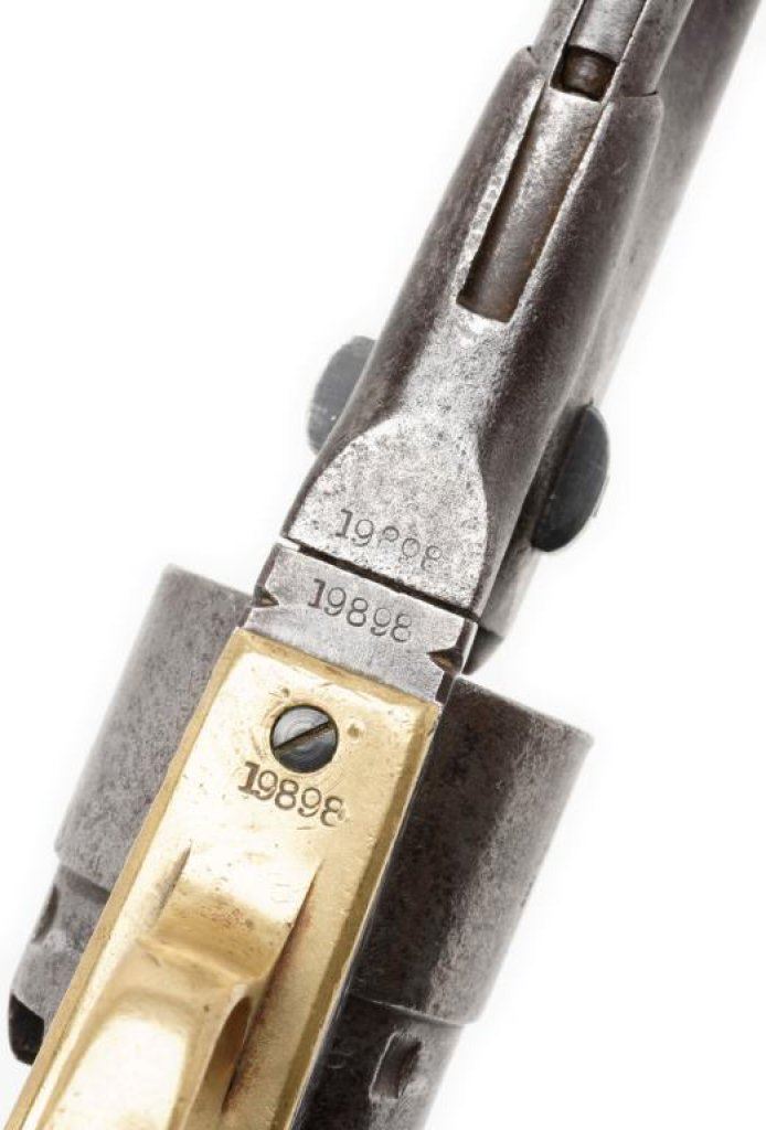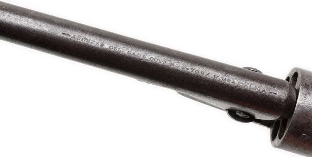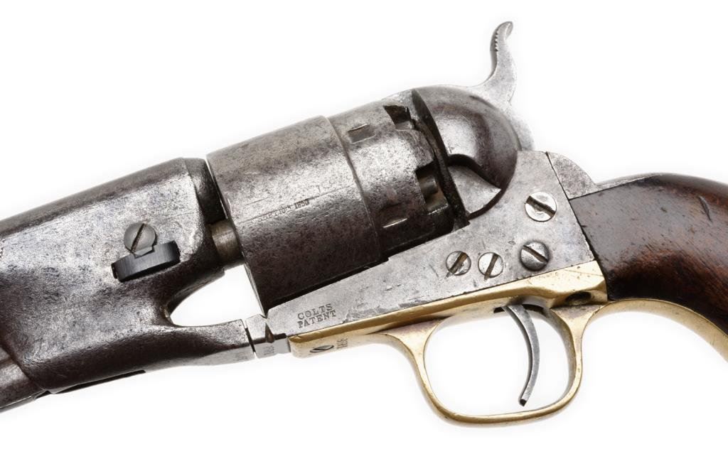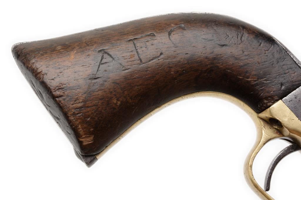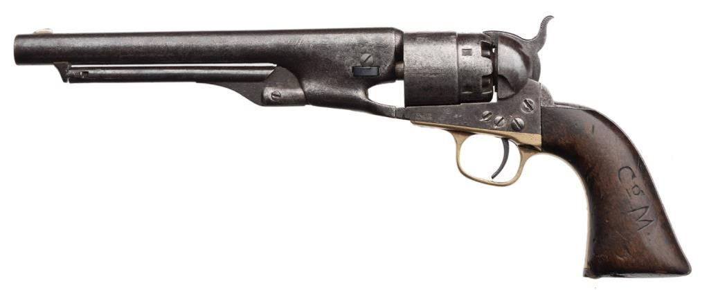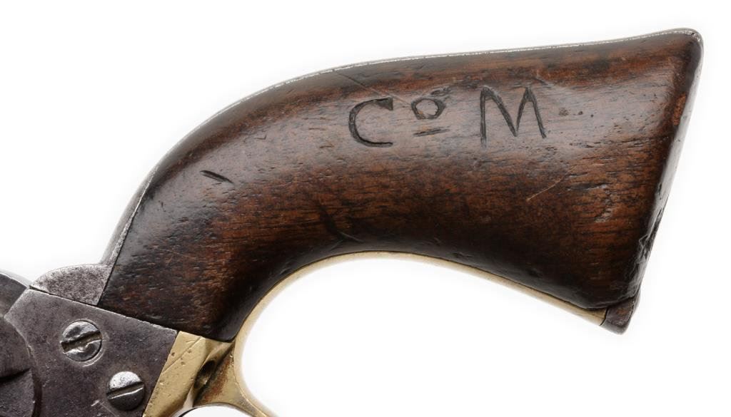 Colt 1860 Army .44 Cal., S/N 19898 with 4 screw frame cut for stock made about 1862 during the Civil War. Grey to brown patina with some light to moderate pitting and erosion. Good barrel address and patent markings. The serial numbers are matching. The left grip is carved "Co. M" in block letters. A notch for I.D. cut on each side of the frame. The grips show small losses and wear from use. The action is good. The wedge and screw are good replacements. Est.: $1,250-$2,500