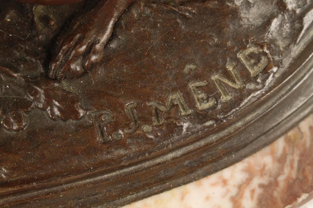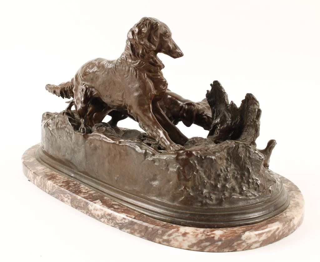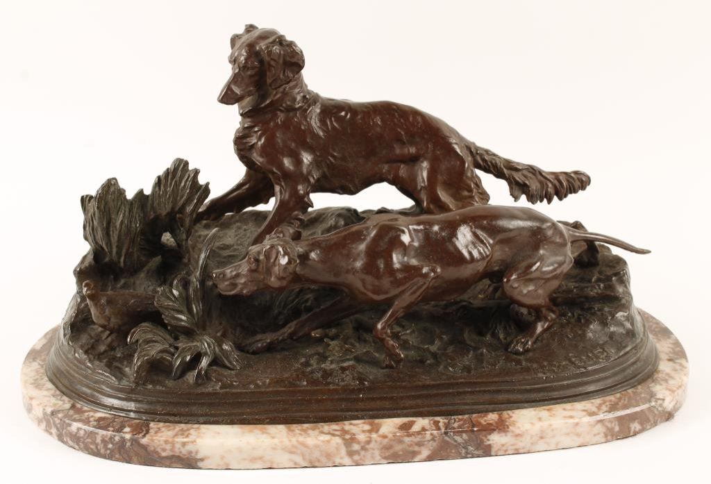 Bronze casting by P.J. Mene of Hunting dogs on marble base, approximately 17” long by 10” wide and 8.5” in height; beautiful patina. From a prominent local collector who purchased the piece from an estate about 1959 and may be period. Est.: $1,500-$3,000.