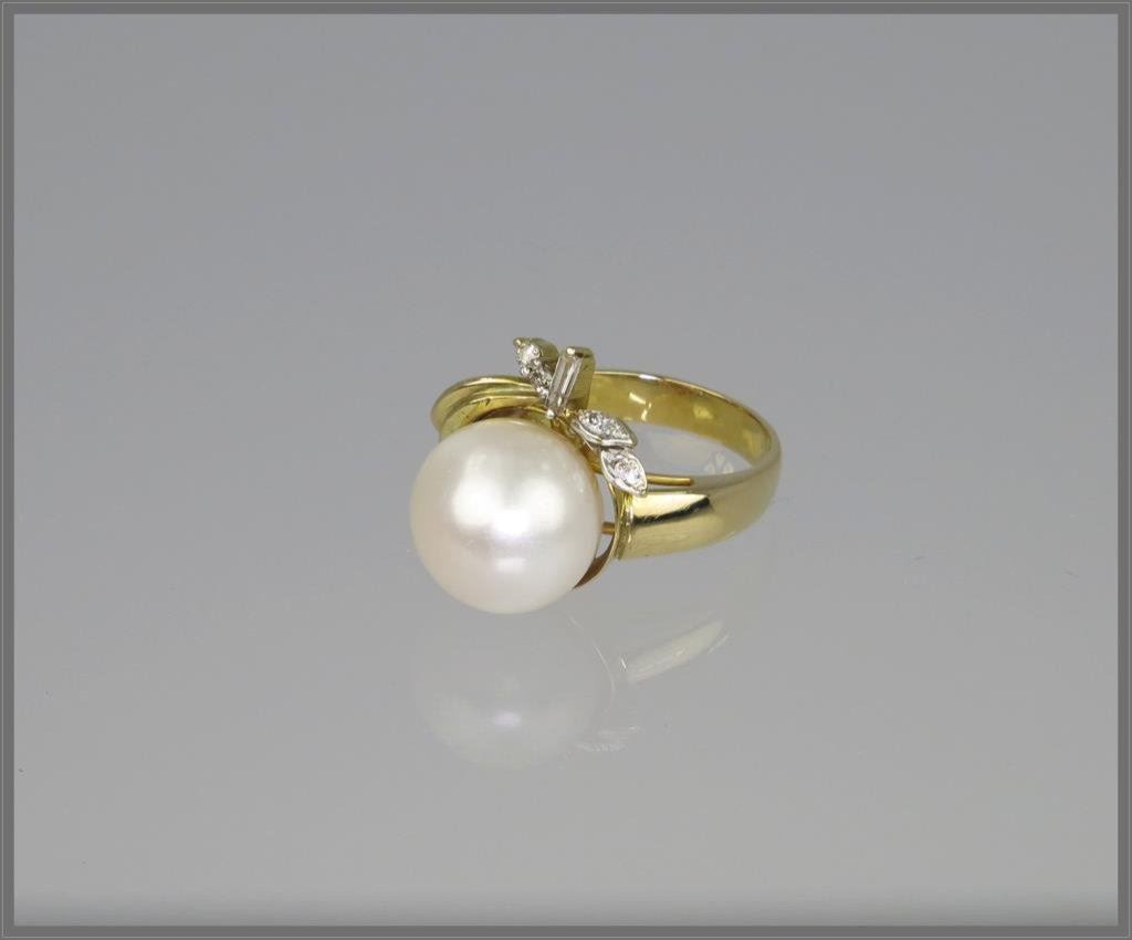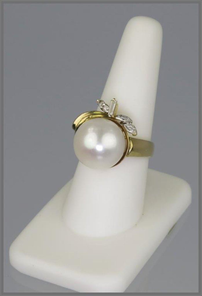 Old Hollywood Style 14.00mm Diameter Pearl and Diamond Ring cultured pearl has excellent luster accented with 1 small baguette and 6 small round Diamonds with H-I colors set in 9.30 grams of yellow gold. Retail $1,800-$2,400 Estimate $1,000-$1,400