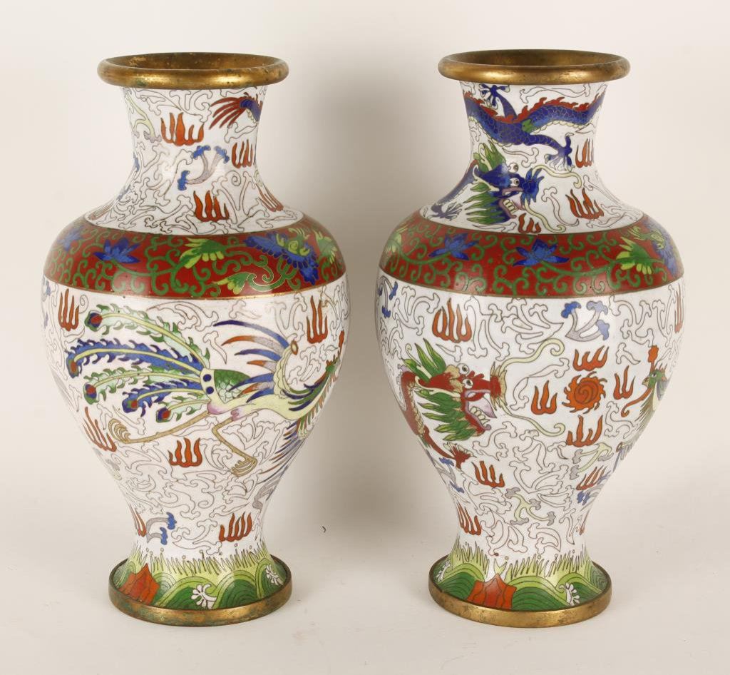 Pair of cloisonné vases with Phoenix bird on white background, large signatures on bottom of each vase; each approximately 12” in height. Est.: $300-$600.