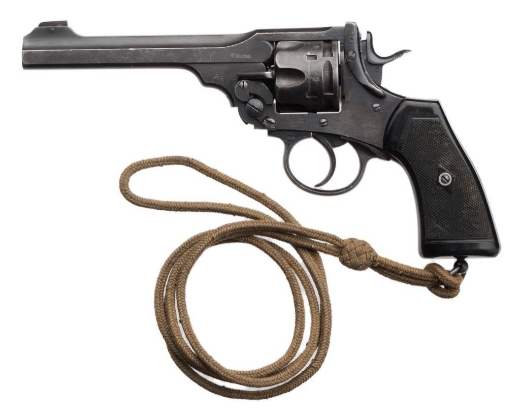 **Webley Mark VI DA revolver, .455 Webley caliber, 6” barrel, S/N 269727, military blued finish, checkered hard rubber grips with lanyard ring and woven lanyard in overall very good to fine condition with considerable original blue, crisp action and markings, fine bore, very good grips. Est.: $500-$1,000.