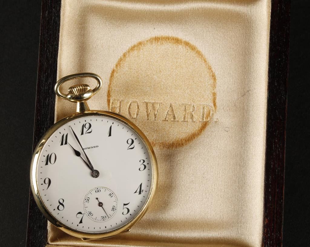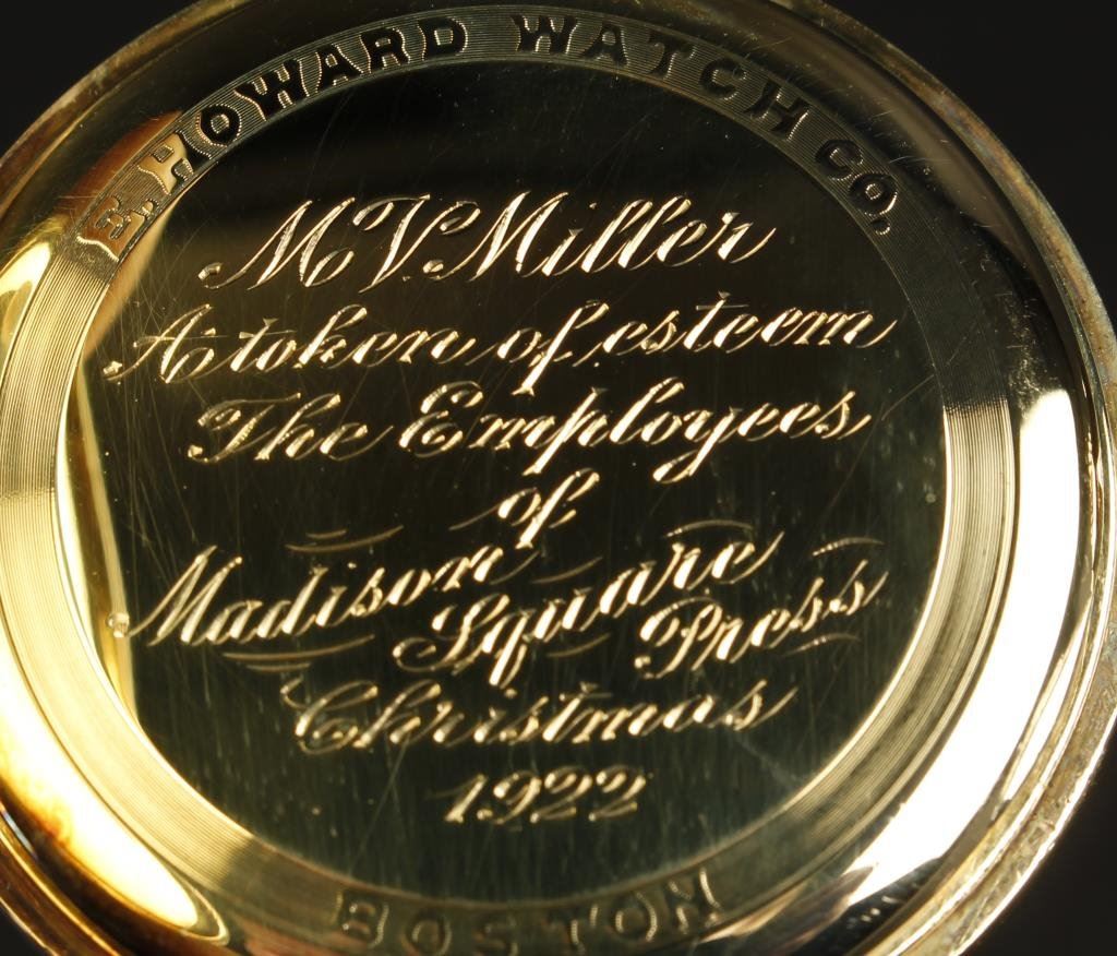 14K gold Howard presentation pocket watch inscribed “Christmas 1922 to M.V. Miller from the employees of Madison Square Press which was related to Madison Square Garden. Great New York history. Serial number 1315628 in box. Excellent to near mint. 17 jewel movement. Est.: $600-$1200
