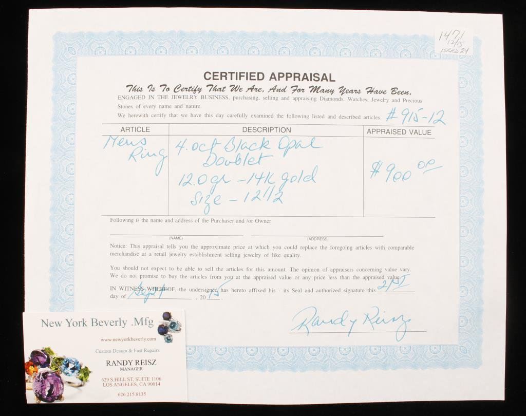 Lot 1471 4.0 carat Black Opal Doublet set in 12.0 gr 14k gold, size 12 1/2. Est:$60