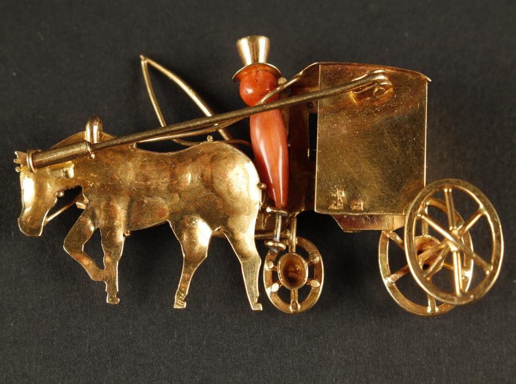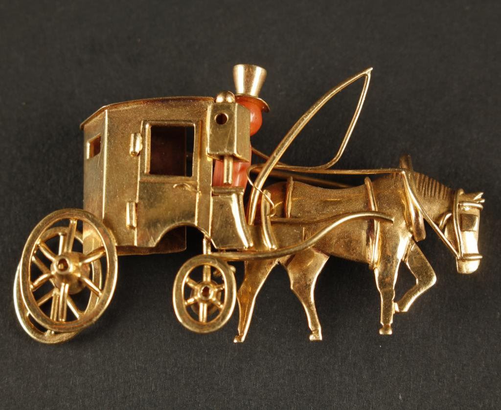 Lot 1473a Vintage hand-made 18K gold custom pin featuring horse and carriage with co