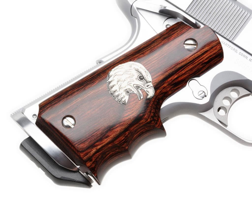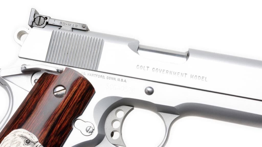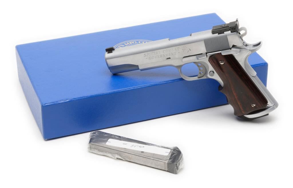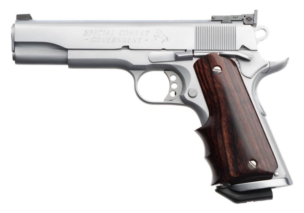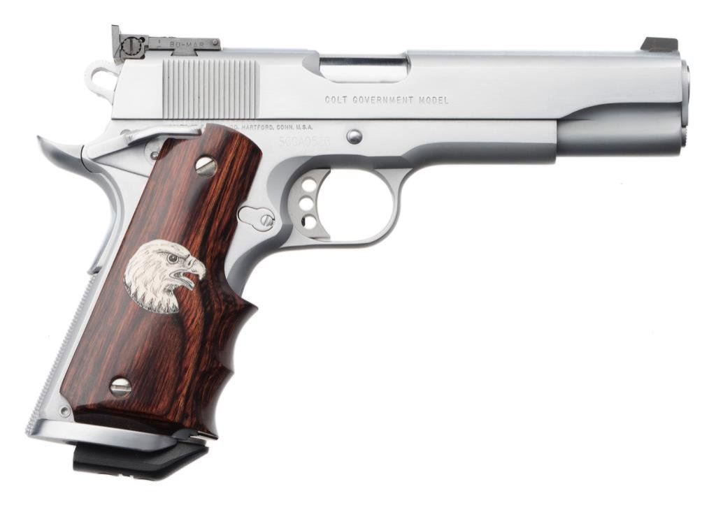 Colt Special Combat Government model .45 ACP in hand chrome finish, competition features, select wood grip with scrimshawed eagle head, S/N SCGA0526. Excellent on original custom workshop box. Est.: $1500-$3000