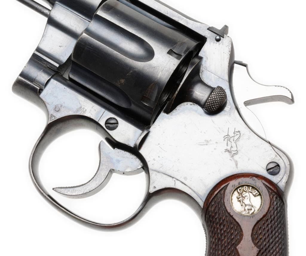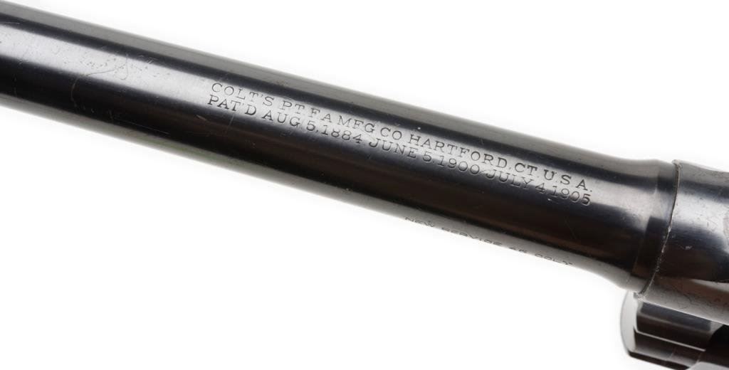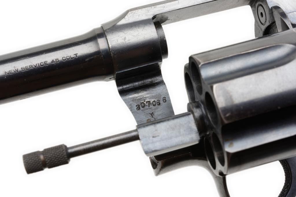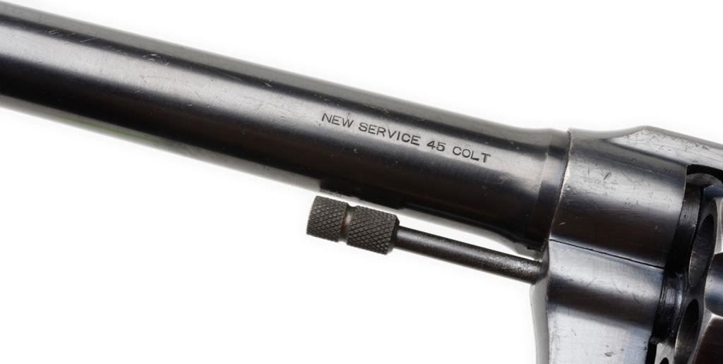 Colt New Service target model in .45 L.C., 7 ½ā BBL revolver with inset medallion checkered wood grips, SN: 307066. Shows checkered straps, flat top frame and target sights. Shows an āSā stamp at the left trigger guard bow for Stembridge Gun Rentals in Hollywood, CA also a YO brand inside underneath the serial number (YO Ranch?). 85%-95% original blue thinning at the high points and edges. Very good grips. Minty bore. Good action. Some storage type scratches. Possible to I.D. from Golden Era films as the grips and flat top make this stand out. From my knowledge there was only 1 target model New Service in the Stembridge Arsenal. Also how did the YO Schreiner brand get inside the frame? Charlie III collected over 50 years and had 100ās of Colts. Interesting to research films and factory records as no letter on this Colt at the time of cataloging. Est.: $2000-$4000