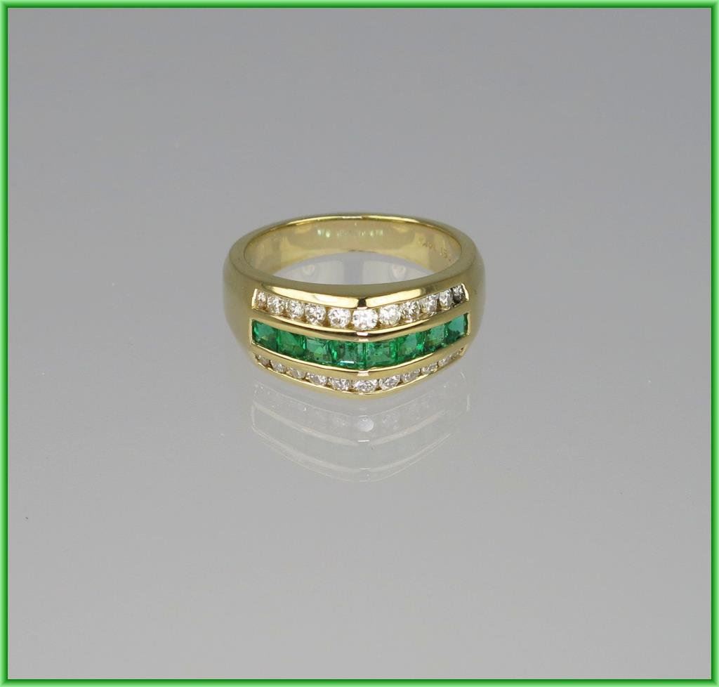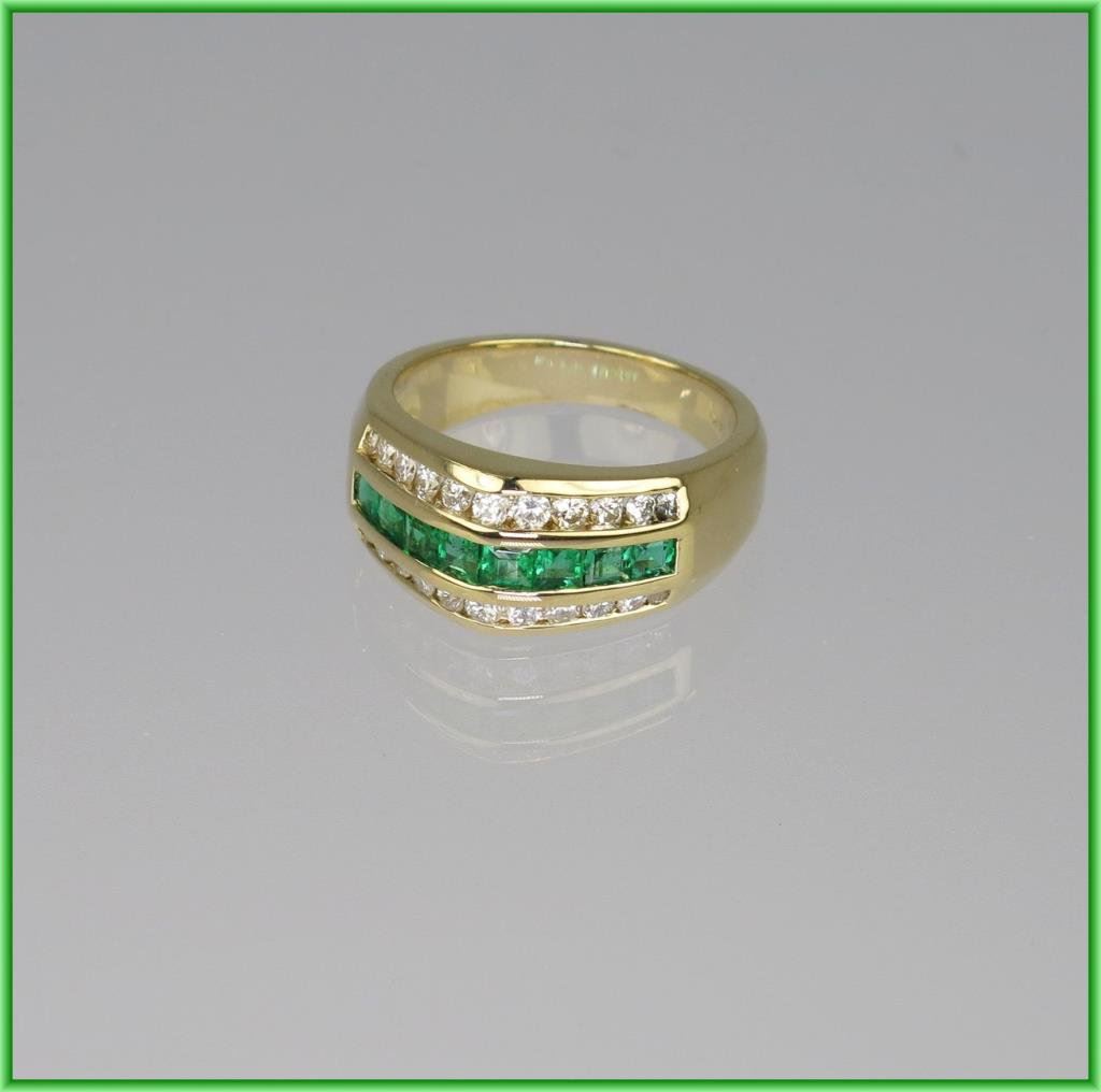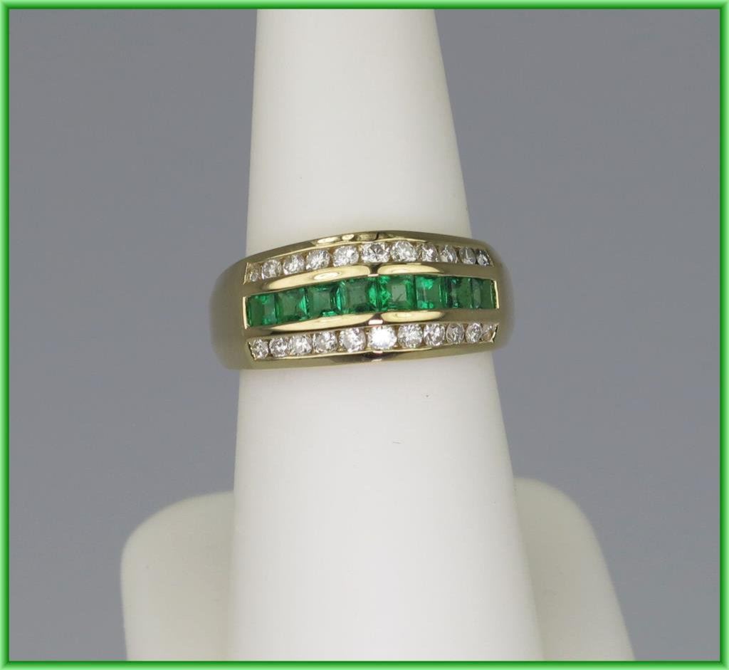 FINE Quality Emerald and Diamond Ring with 8 princess cut emeralds weighing approx. 0.80 carats with 22 round ‘IDEAL’ cut Diamonds weighing approx. 0.50 carats with H-I colors and VS clarity set in 6.80 grams of yellow gold. Retail $2,400-$2,800 Estimate $1,500-$1,700