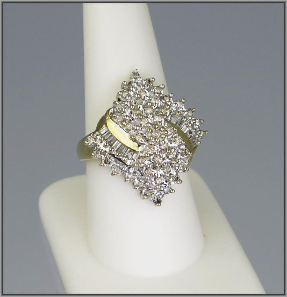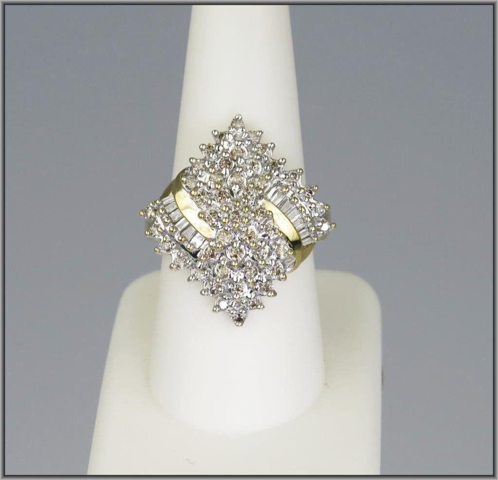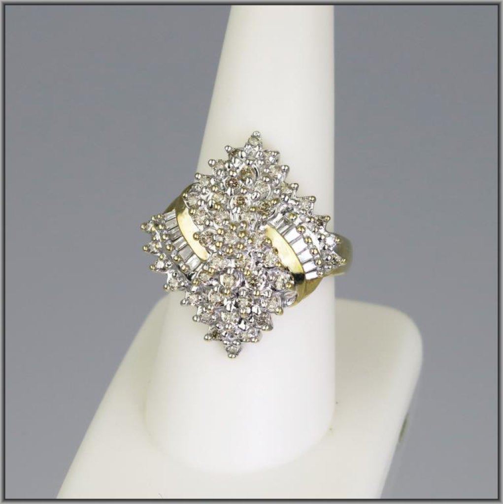 Pure Glamor Diamond Cocktail Ring with 58 round and baguette cut white and champagne Diamonds weighing 1.00 carats total set in 8.6 grams of 10 karat yellow gold. Retail $2,000-$2,600 Estimate $900-$1,400
