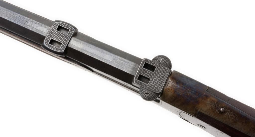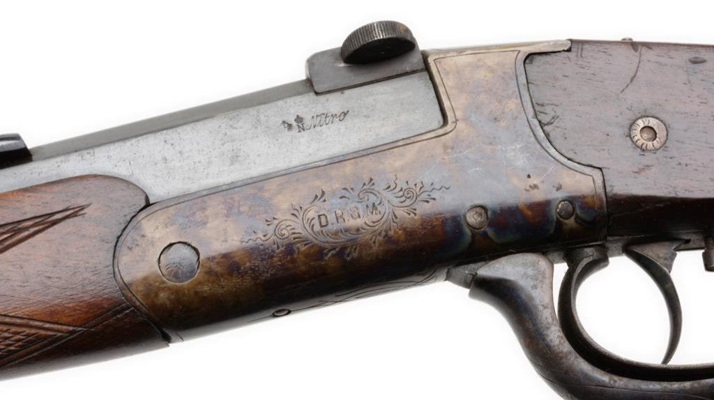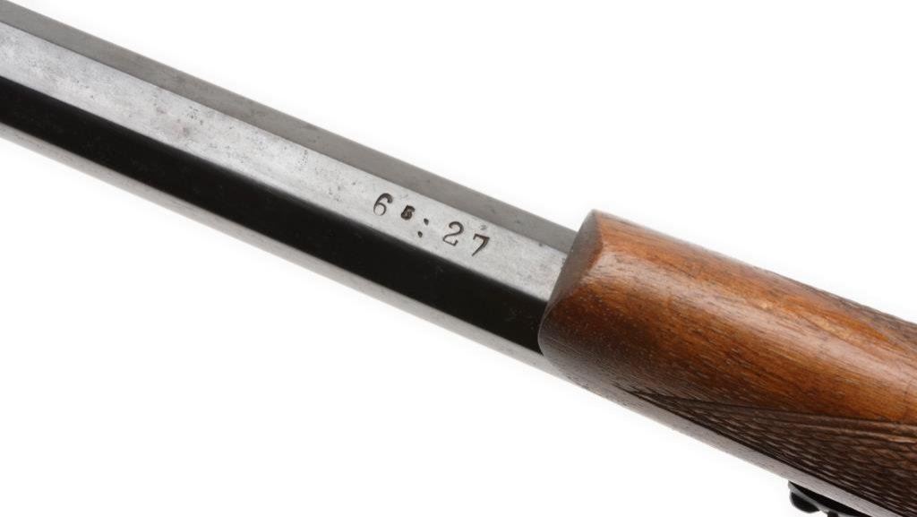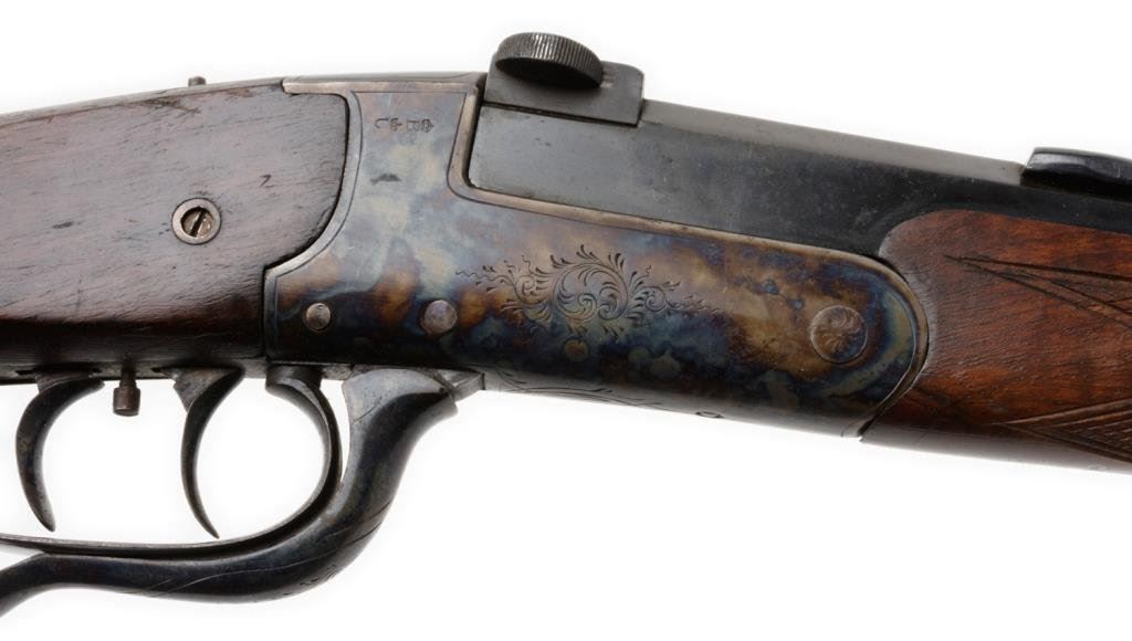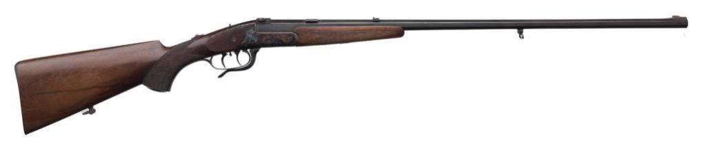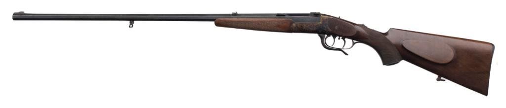 Single barrel German stalking rifle with double set triggers, 6.5mm caliber, 28.5” octagon barrel, S/N 27, blued and case hardened finish, checkered wood stocks; claw mount base for scope; overall very good to near fine condition with vivid case colors on receiver. Est.: $750-$1,500.
