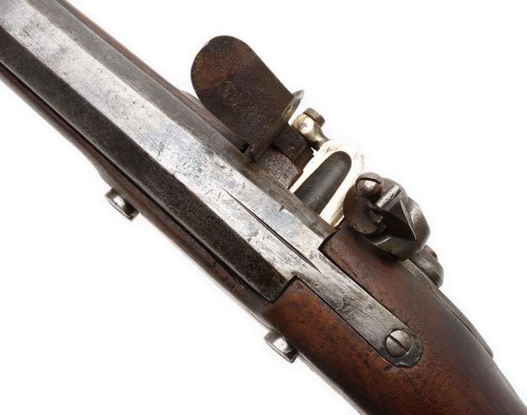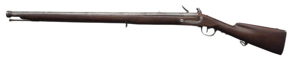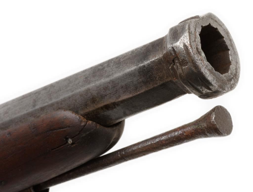 Heavy flintlock long gun signed “A. Fortschav” on lock plate, approximately .85 caliber, 34” octagon barrel with ringed cannon-type muzzle; probably for wall or rampart use; overall fair to good condition. Est.: $800-$1,600.