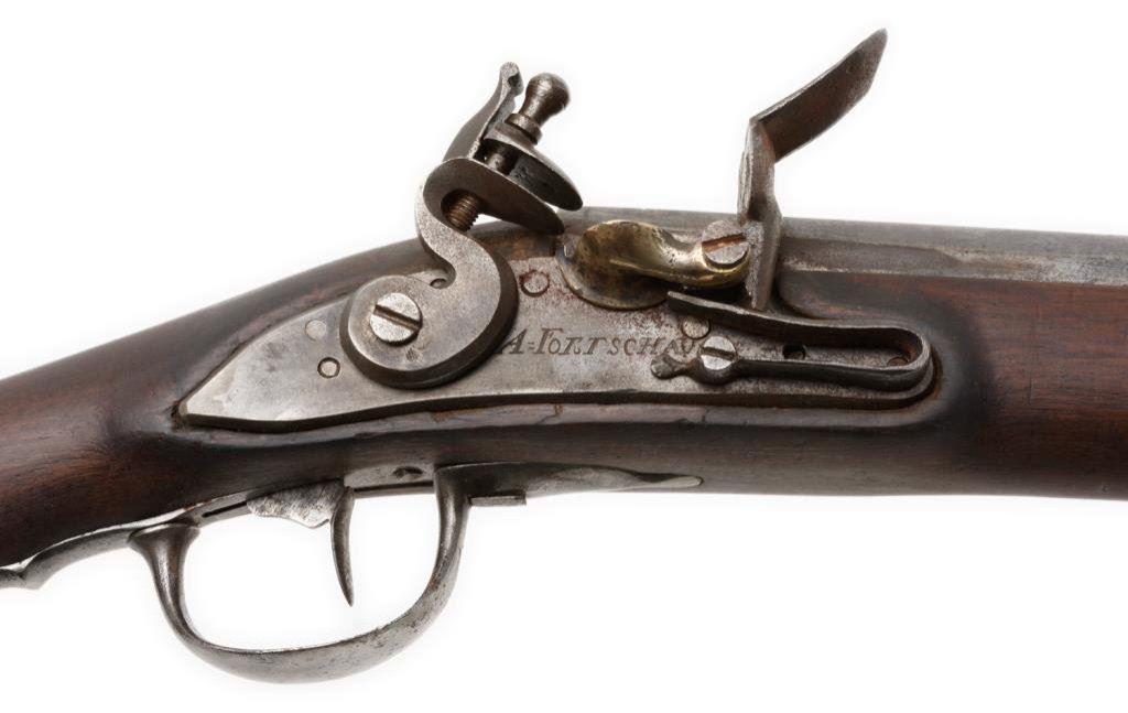 Lot 1499 Heavy flintlock long gun signed “A. Fortschav” on lock plate, approximatel