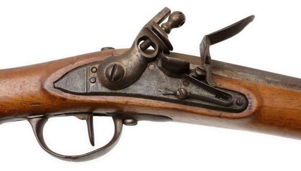 Shortened flintlock musket, .70 caliber, 27” barrel, two barrel bands and full length wood stock; no visible markings on lock plate; in overall good “out-of-the-attic” condition showing a heavy brown patina on metal surfaces, good action and good wood. Est.: $800-$1,600.