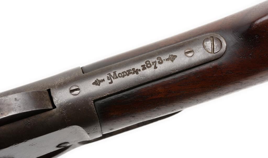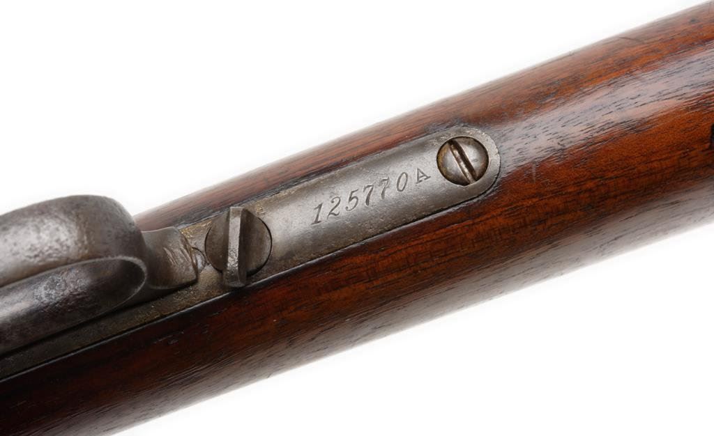 Winchester Model 1873 lever action rifle, .32-20 caliber, 24” octagon barrel, S/N 125770A, blued finish, wood stocks in overall good condition with a grey patina to metal surfaces and scattered spots of erosion and some pitting on the left side of the receiver and loading lever; good action and markings, rough bore, good wood. Est.: $750-$1,500.