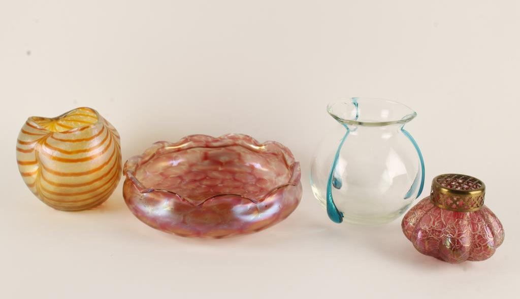 Four piece lot of art nouveau glass antiques circa 1890-1910. Rindskopf, Kralik and Loetz. All fine condition. Est.: $600-$1200