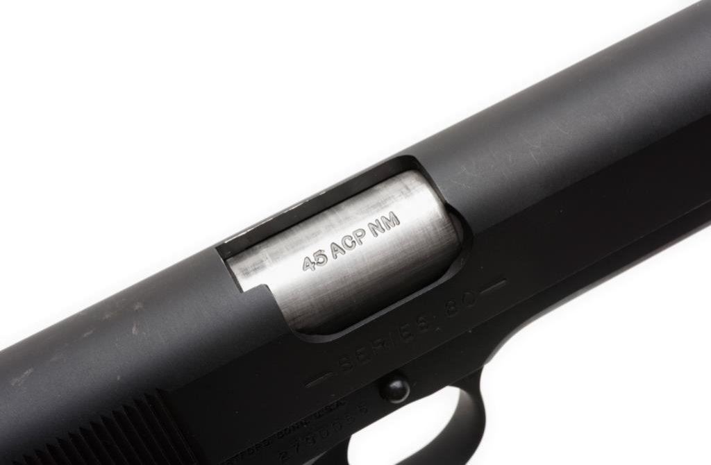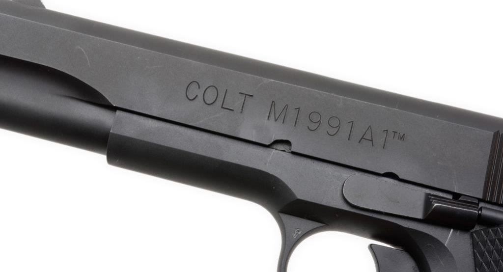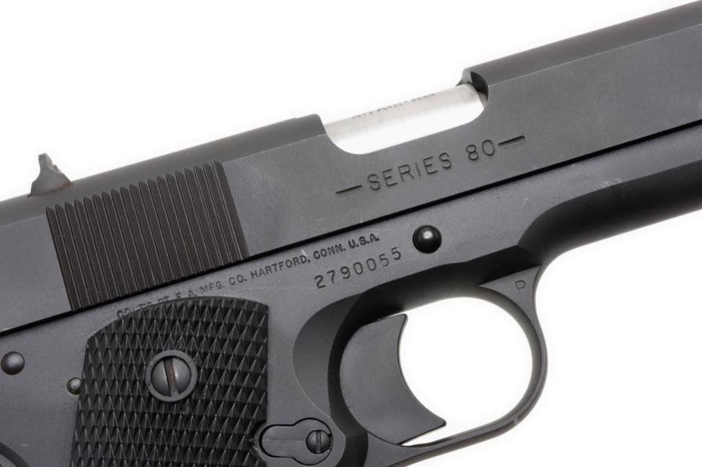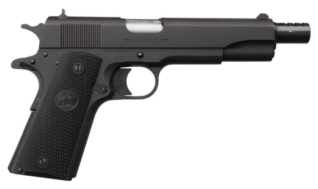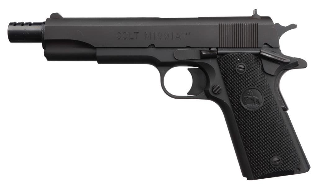 *Customized Colt Model 1991A1 Series 80 semi-automatic pistol, .45 caliber, 6” extended and ported barrel, S/N 2790055, mat black finish, no magazine, checkered Colt hard rubber grips in overall fine condition with a fine bore, crisp action, sharp markings and fine grips. Est.: $700-$1,400.