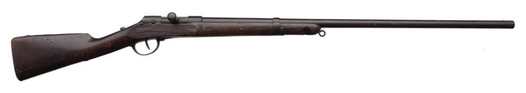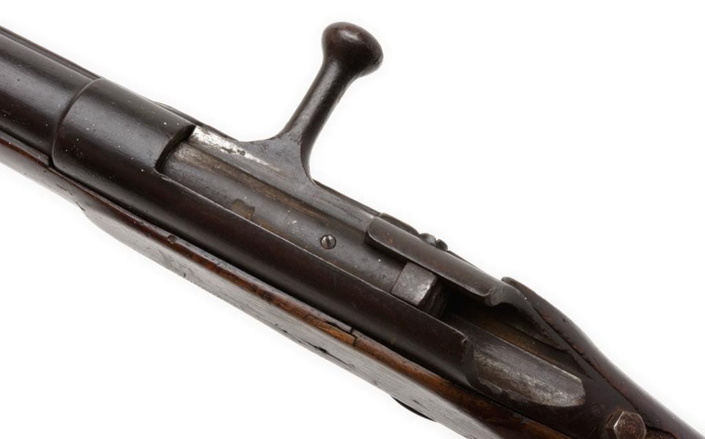 Shortened flintlock musket, .70 caliber, 27” barrel, two barrel bands and full length wood stock; no visible markings on lock plate; in overall good “out-of-the-attic” condition showing a heavy brown patina on metal surfaces, good action and good wood. Est.: $800-$1,600.