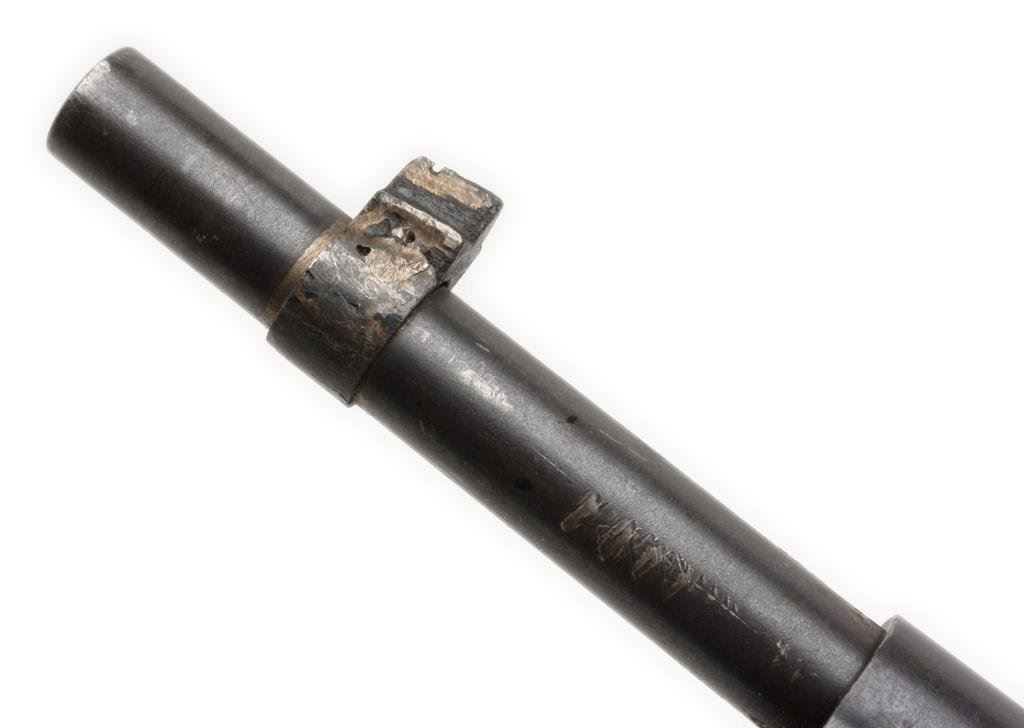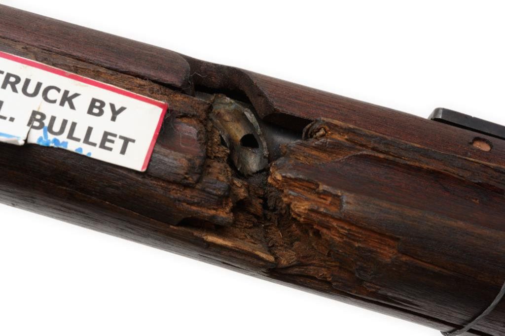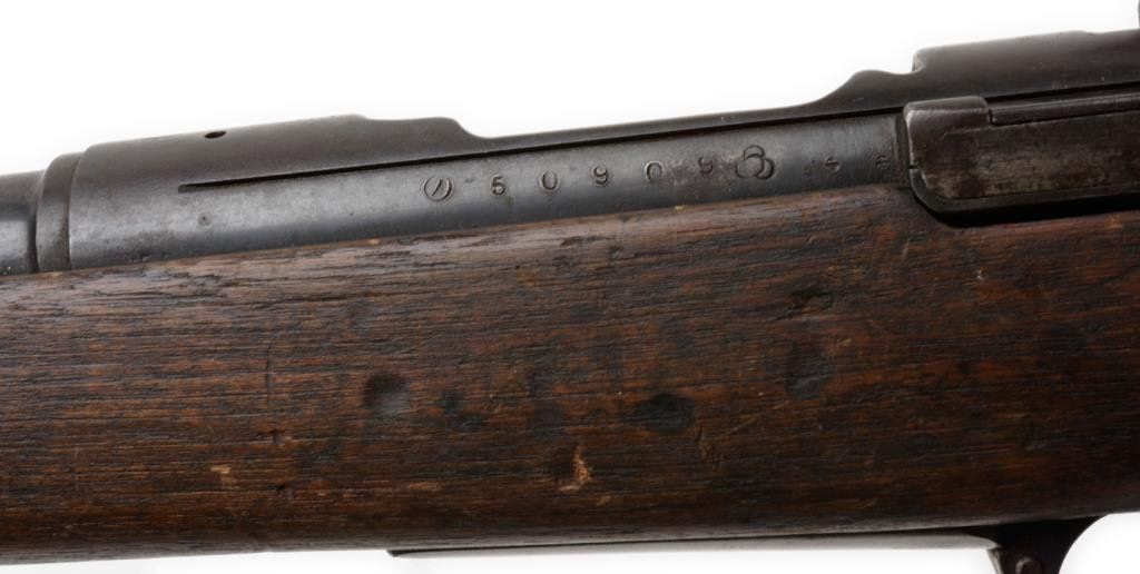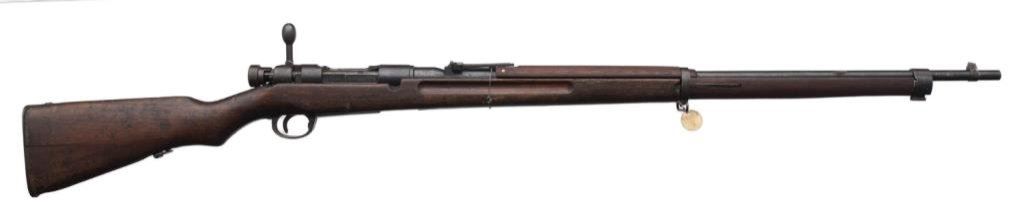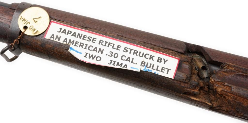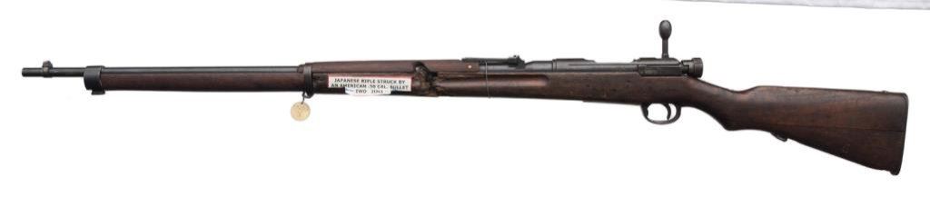 **Interesting Japanese Arisaka bolt action rifle, 6.5mm caliber, 31.5” barrel, S/N 50909, blued finish, wood stock. This gun is in overall fair to good condition as un-cleaned and displaying a large bullet strike on the left side of the barrel just in front of the rear sight; there appears to be another bullet strike on the right front side of the barrel. The mum and Japanese characters on the top of the receiver are un-ground and there is a brass tag hanging from the front sling swivel marked “IWO JIMA 7”. From the estate of the late Col. William Orbelo. Est.: $500-$1,000.