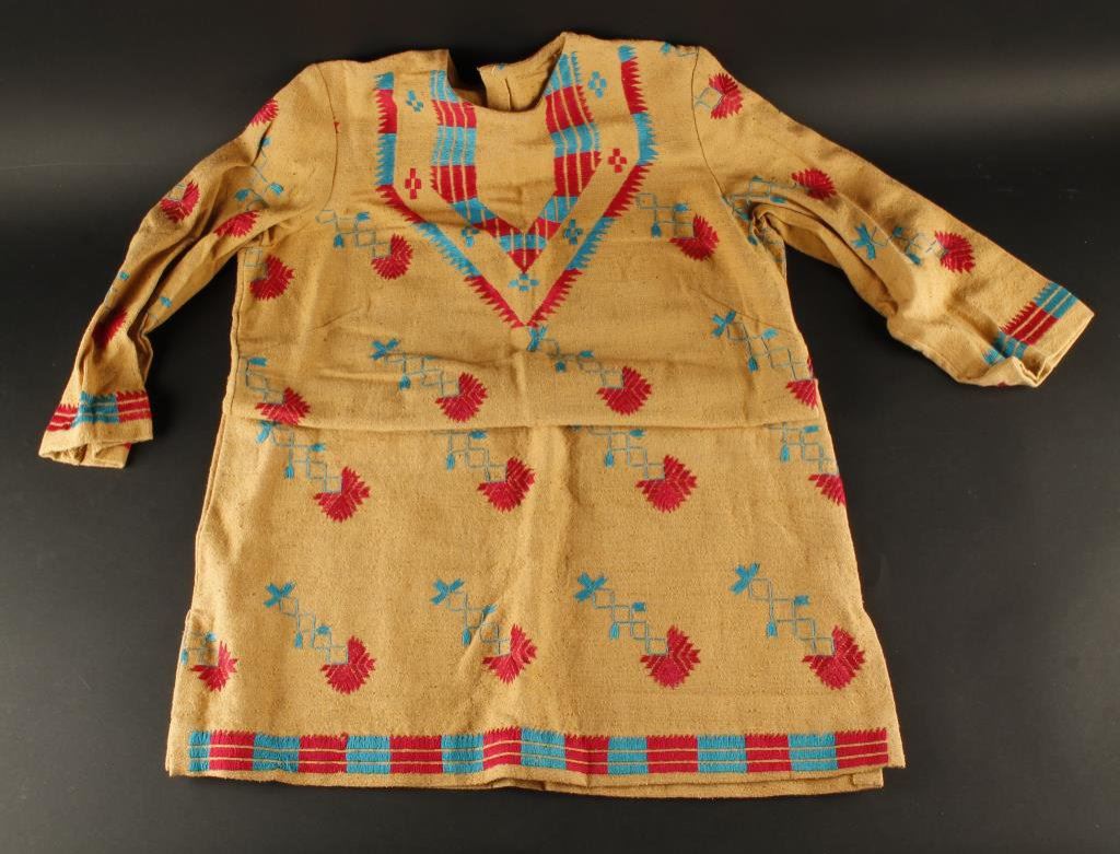 Native American Indian embroidered on sack cloth Princess dress ca 1920-1950; near fine condition. Est.: $300-$600.