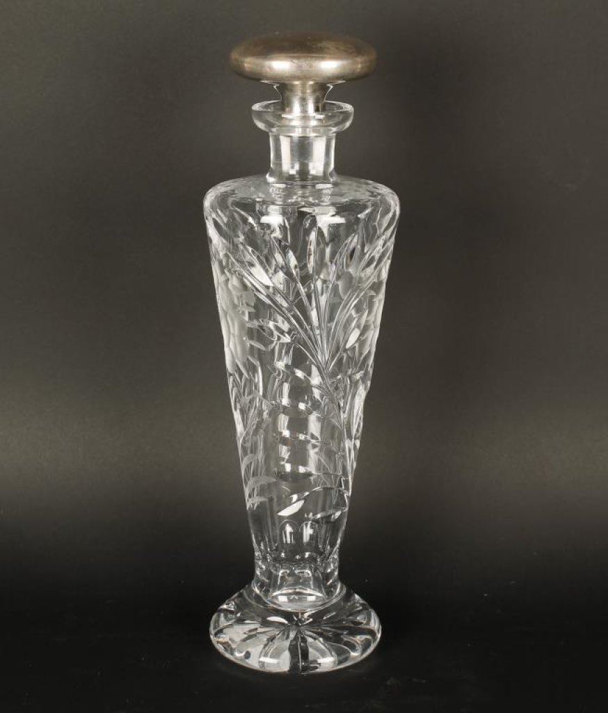 Lot 1547 Ladies vanity bottle in cut glass with sterling stopper. Approximately 12”