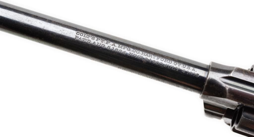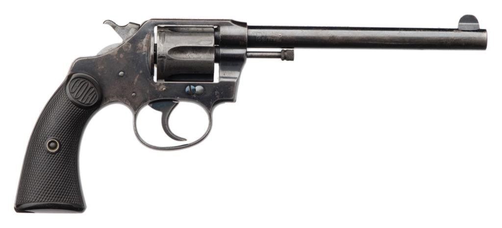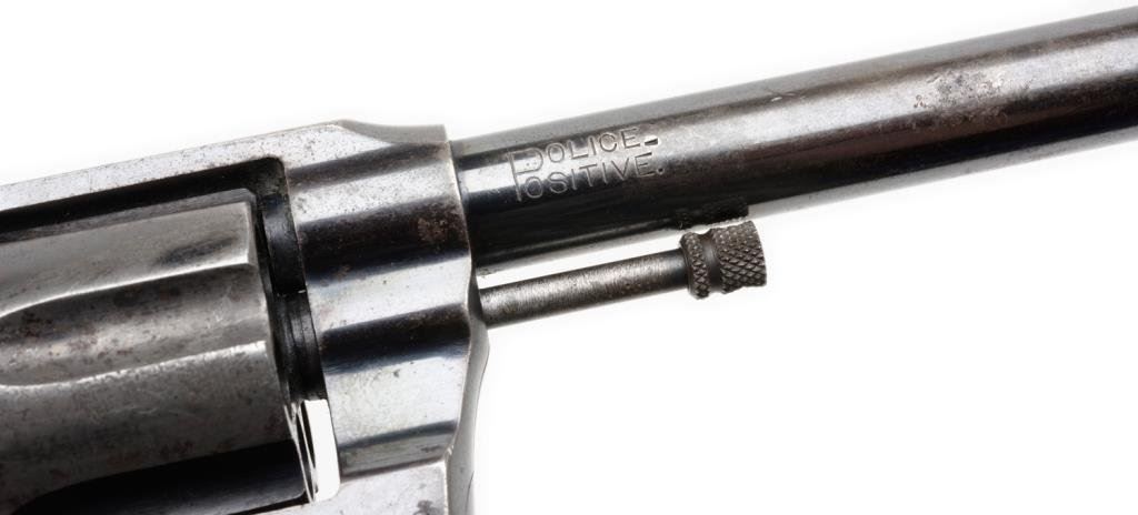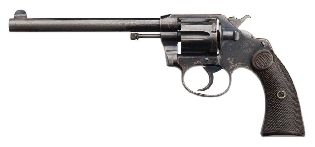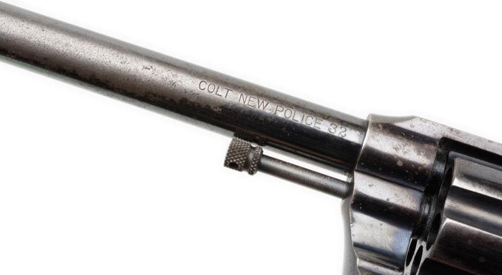 Colt New Police revolver, .32 cal., serial #49074. The pistol is in overall good to nearly very good condition with a desirable 6” barrel. The barrel retains approximately 40% of its thinning blue finish with scattered surface erosion, while the remainder of the pistol shows nearly 60% of its thinning blue finish. The screw heads and trigger still show significant nitre blue finish. The hard rubber Colt marked grips are in good condition with a small chip at the right rear. The bore is very good and the action is crisp, while the markings remain sharp on this nice, old Colt. Est.: $300-$600.