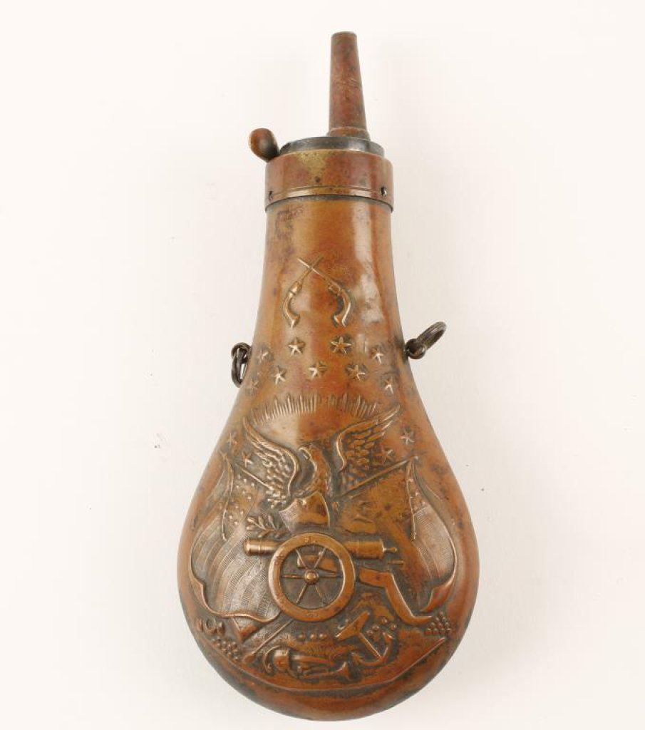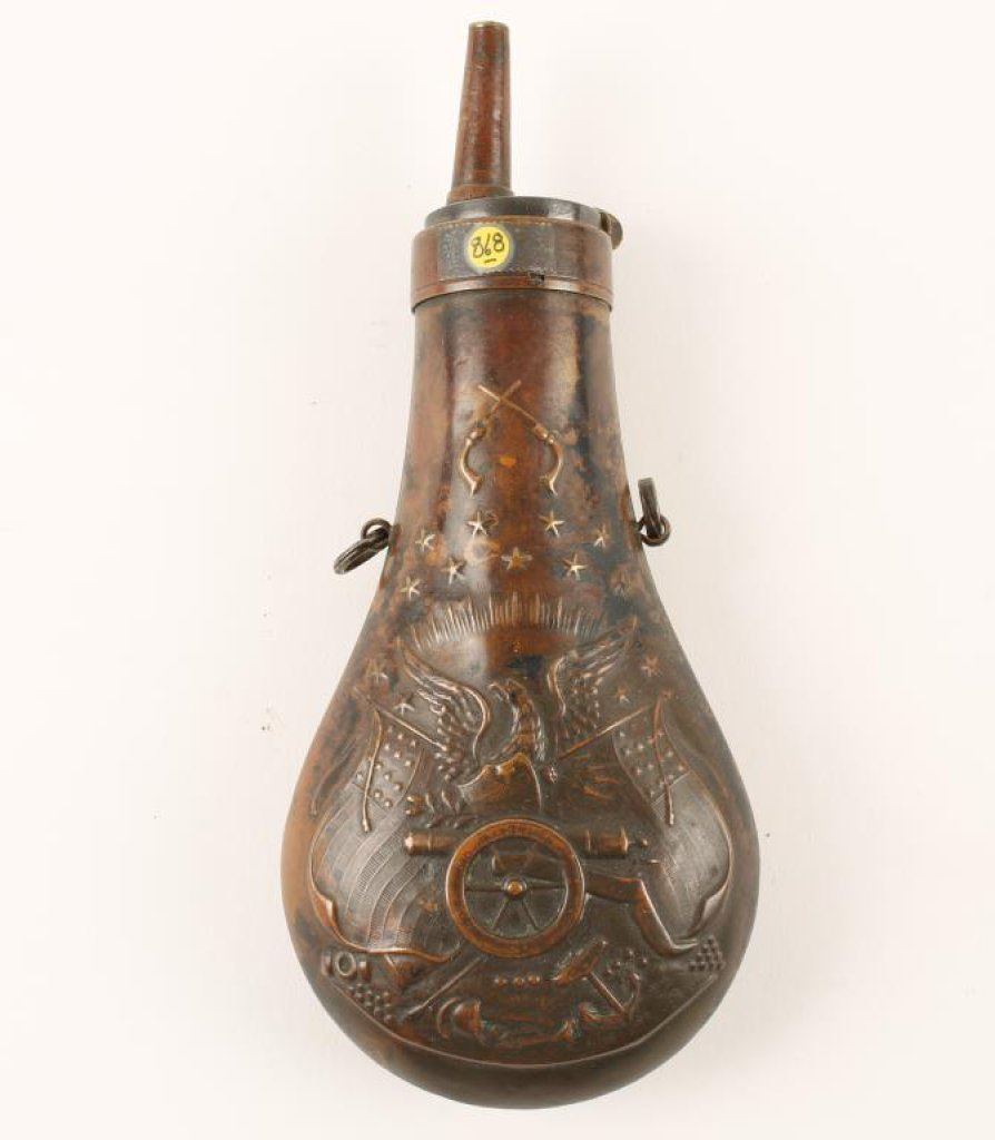 Brass Navy powder flask with embossed crossed pistols over spread eagle, flags, cannon and anchor on both sides. Approximately 7" tall with hanging rings (2). Condition: This desirable flask is in overall very good condition showing a dark patina with reddish hues to body's surface and blue on the charging ring. The seam is tight. EST.: $600-$1200