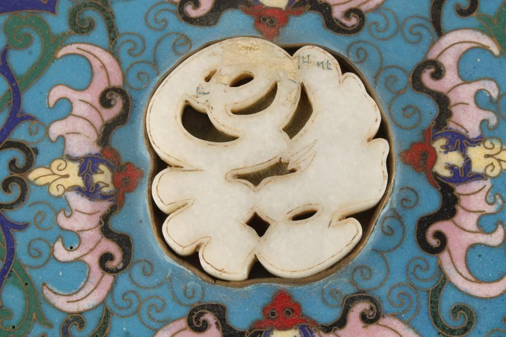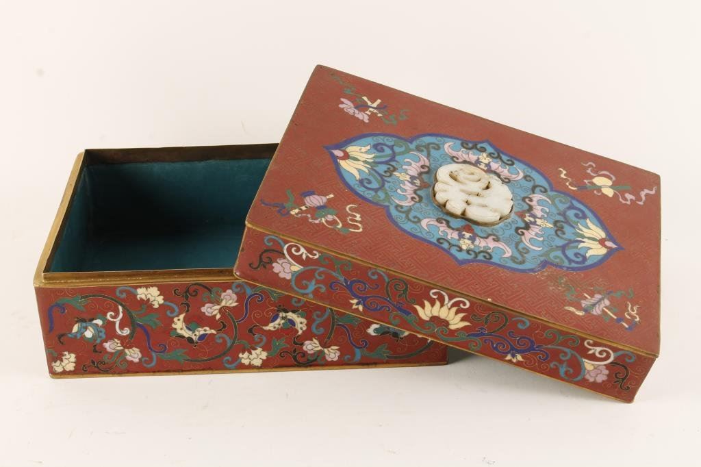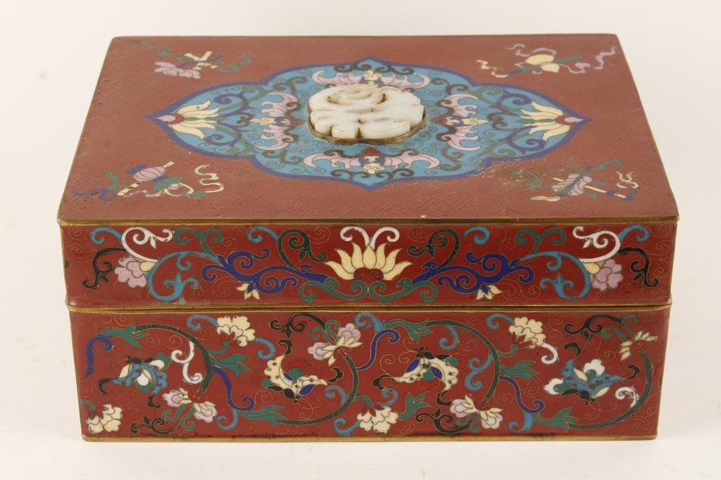 Chinese cloisonné box circa late 19th to early 20th century showing multi-color enamel and bat effigy's with carved jade mounted in lid. Measures 4 1/2" in HT by 9 3/4" in width. Very good plus condition with minor aging and small imperfections. Over 100 years old and of a style reserved for Chinese taste probably not exported. From major collector's estate. Est.: $600-$1200