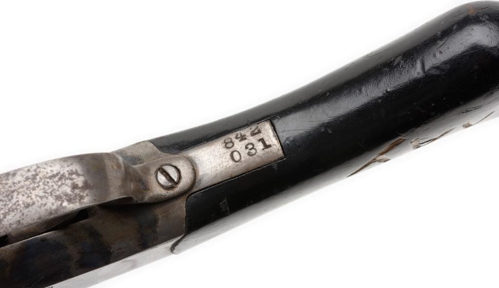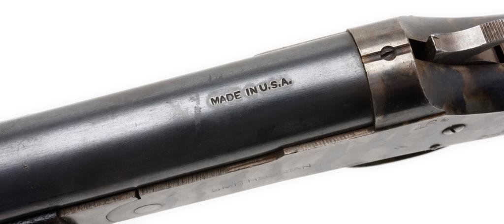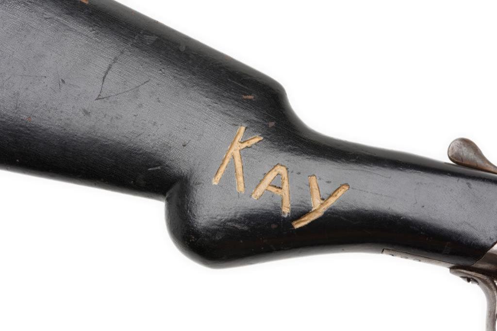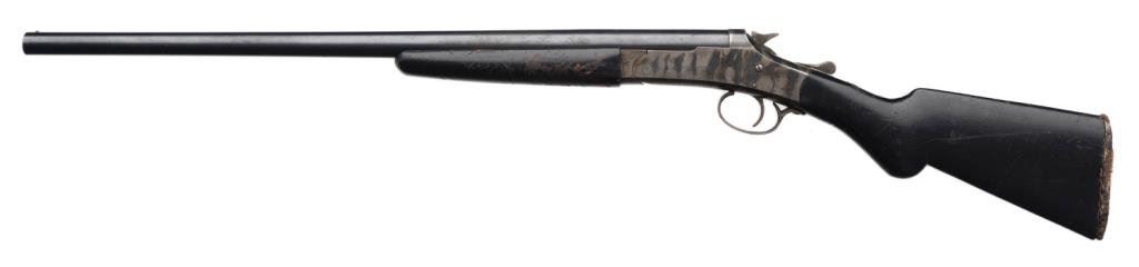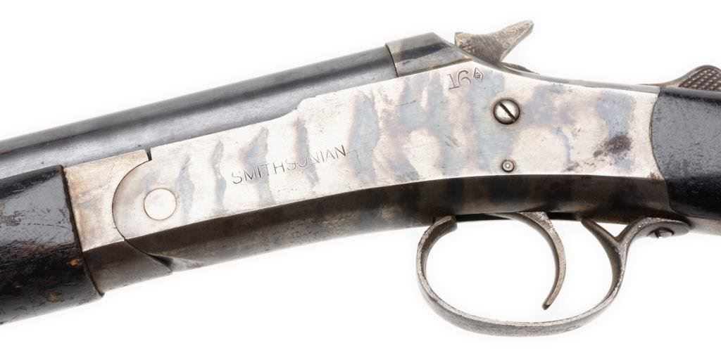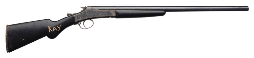 **Smithsonian brand single shot shotgun, 16 gauge, 24” barrel, S/N 842031, blued and case hardened finish, wood stocks in overall fair to good condition showing considerable original finish, very good bore, strong action and fair wood with “KAY” carved into the right side of the butt stock and a replacement butt plate that itself needs to be replaced. Est.: $100-$200.