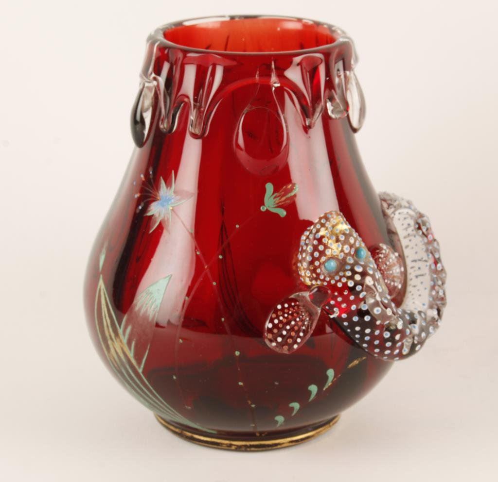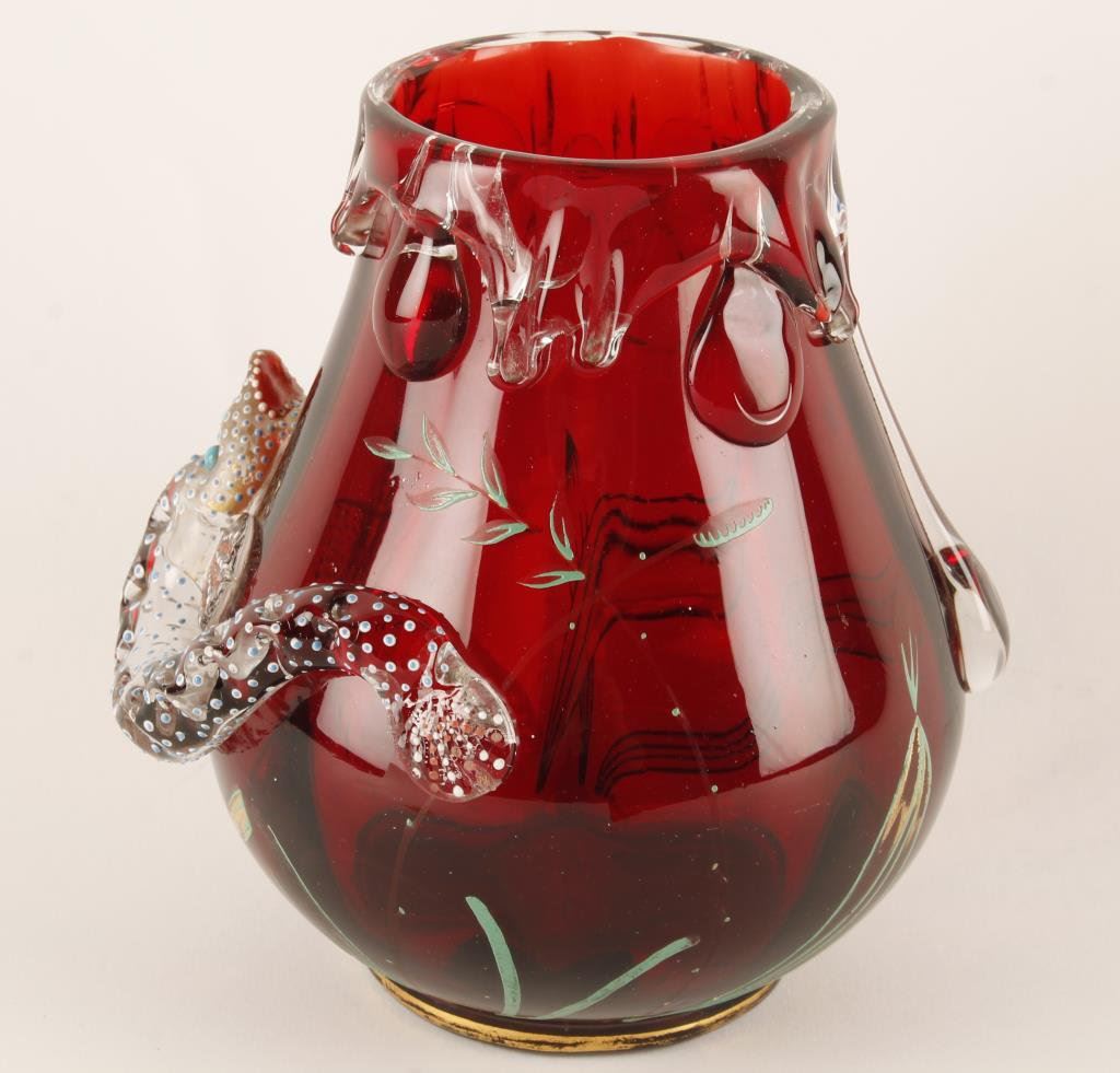 Lot 1568a Moser ruby red vase with fish applied. Circa 1910. Est.: $300-$600