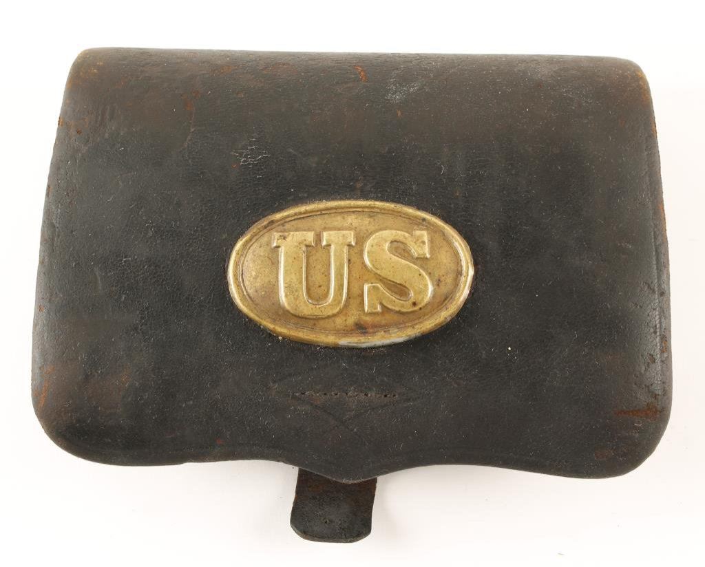 Civil War period rifleman's leather cartridge box to hold .69 caliber combustible cartridges with oval brass "US" cartridge box plate. Both tin inserts are present. Condition: This box is in overall good condition with interior tab missing. No visible maker's mark. EST.: $250-$500