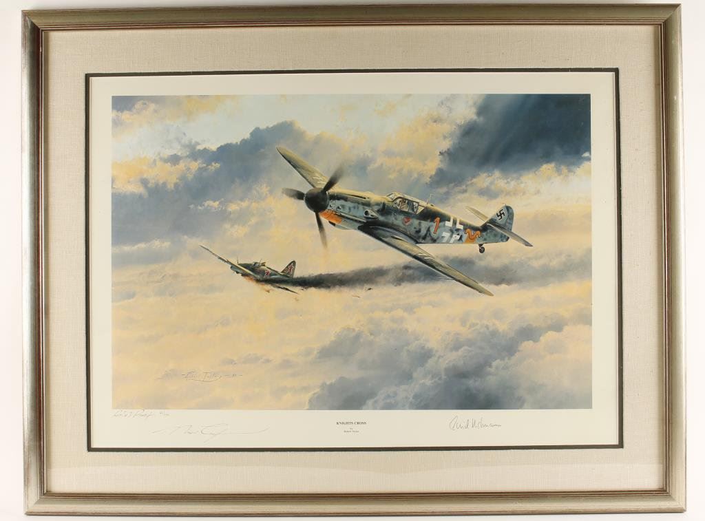 Beautifully framed and matted color Artist’s Proof of limited edition (46/100) litho of “Knight’s Cross” by noted artist Robert Taylor, hand signed by both Taylor and the subject of the work, German fighter pilot Erich Hartmann, approximately 28” x 36” overall. Est.: $200-$400.