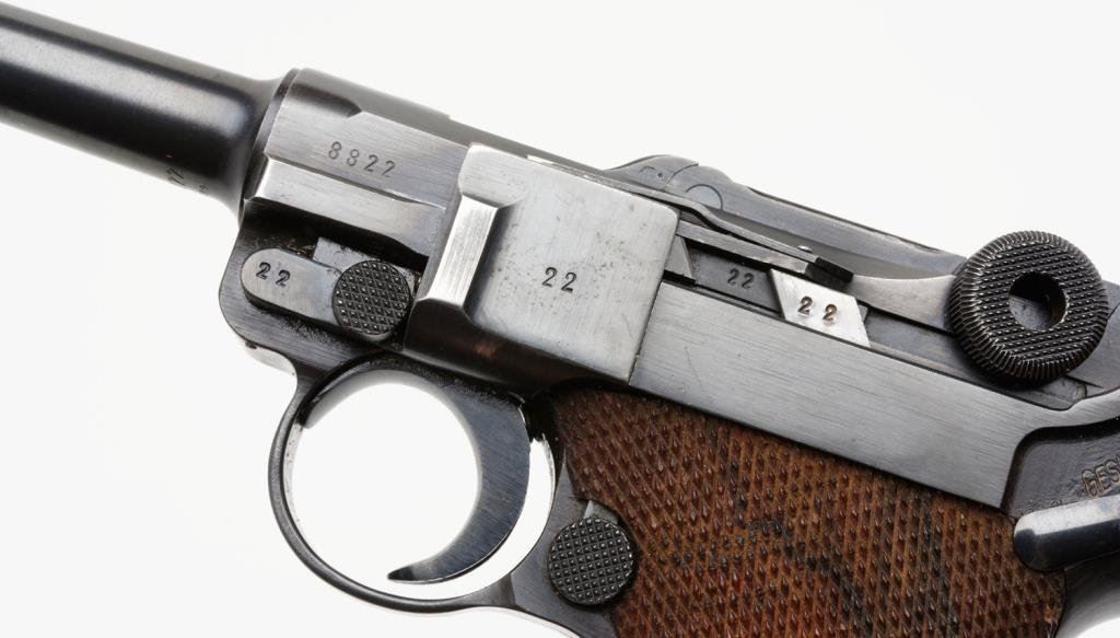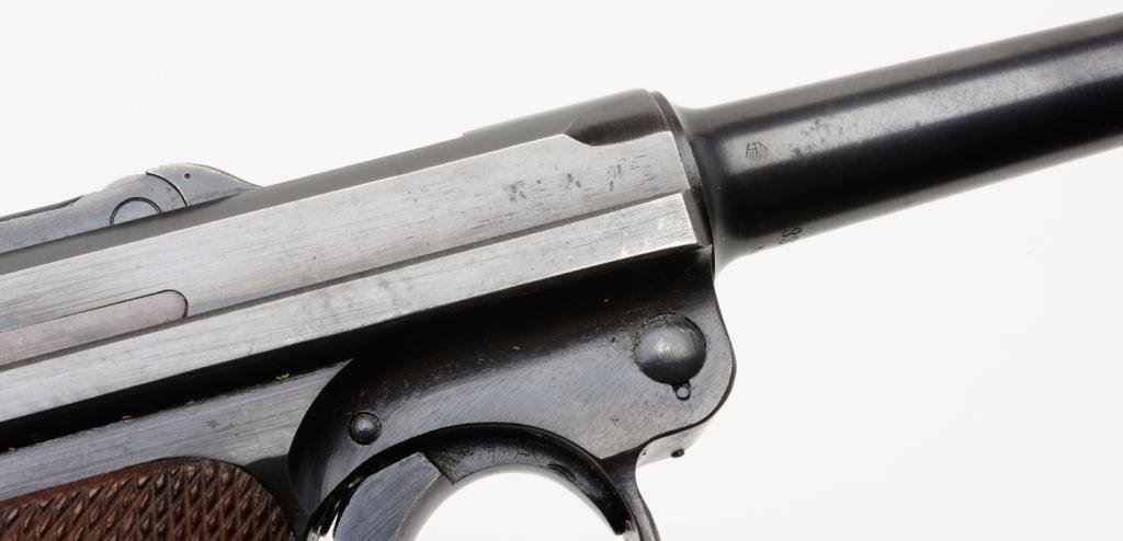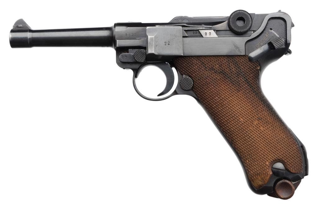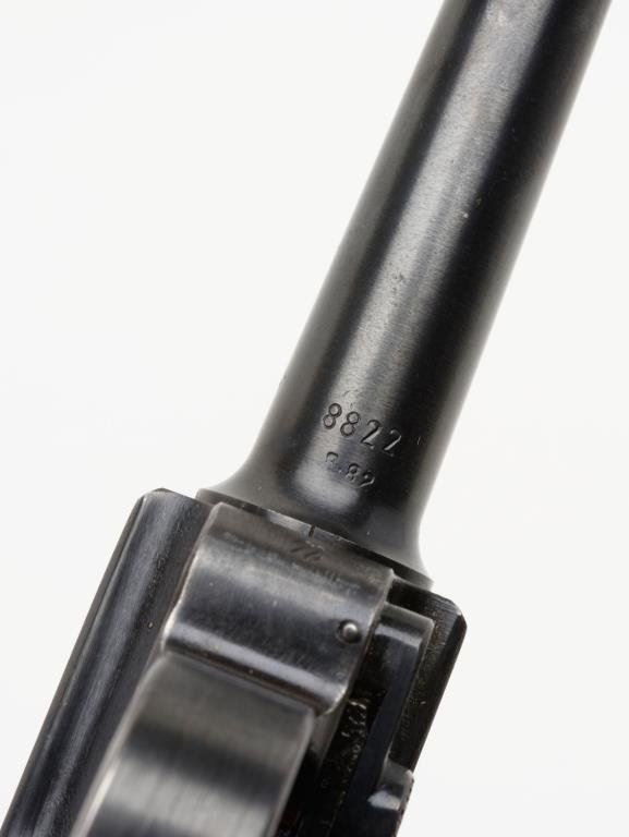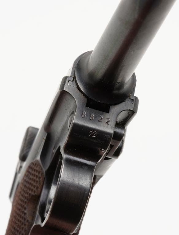**Early nazi era German Luger by Mauser (S-42) semi-automatic pistol, 1939 date on breech, 9mm caliber, 4” barrel, S/N 8822 n, blued finish, matching visible numbers, checkered wood grips in overall very good to fine condition with high point wear and approximately 95% original finish; bottom left grip is marred but otherwise grips are very good to fine. Est.: $800-$1,600.