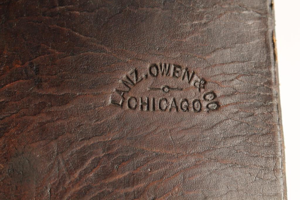 U.S. Model 1881 Leather Two-Position Flap Holster For Colt Single Action revolver or Smith & Wesson Single Action revolver, six rivets attaching belt loop which is marked “LANZ, OWEN & CO. CHICAGO." Condition: This holster is in overall very good to near fine condition with sharp maker’s mark and initials “G.P.” stamped on the end of the securing flap. EST.: $600-$1200