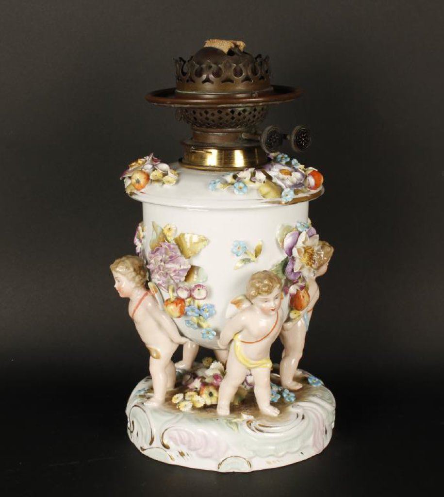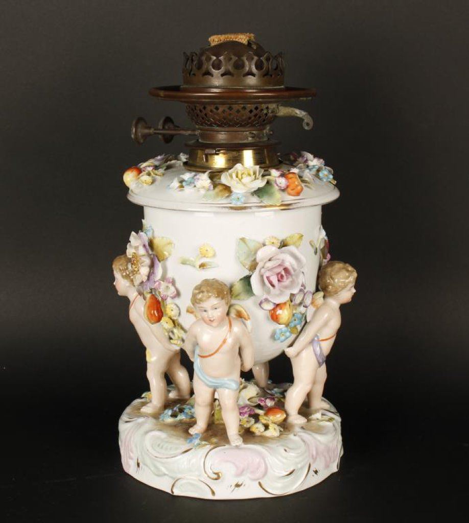 Lot 1587 Sitzendorf (German) 19th to early 20th century oil lamp with cherubs. Meas