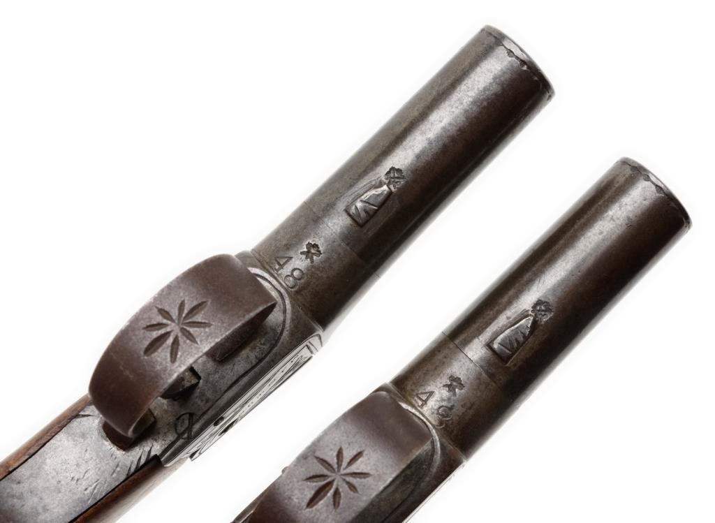 Pair of British muff pistols marked “Manton London”. Cross keys proofed and numbered 48 on each pistol. Very good plus to near fine condition. May be period copies as too plain for this top maker or just late and made by descendants. Est.: $400-$800