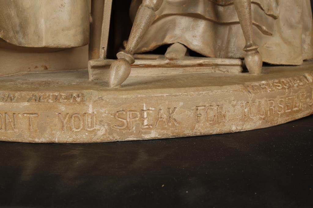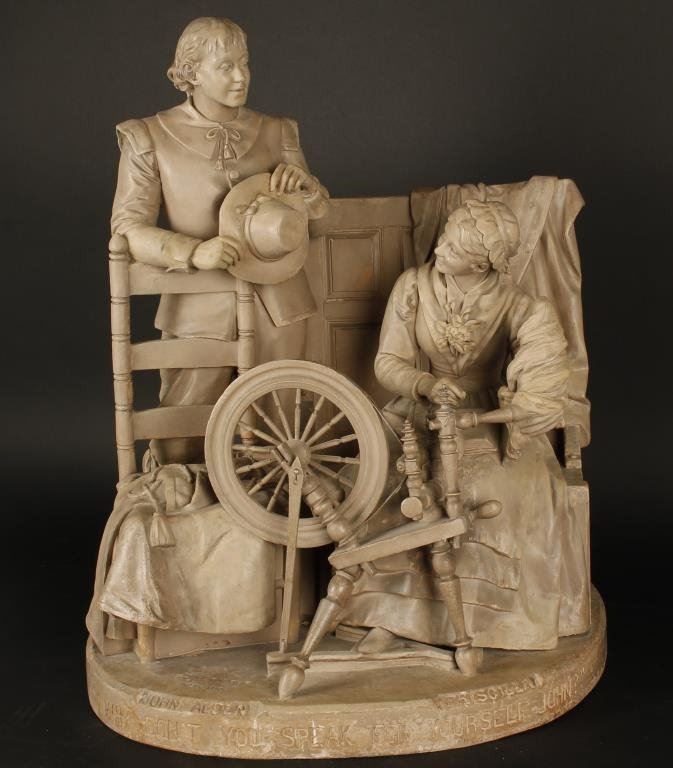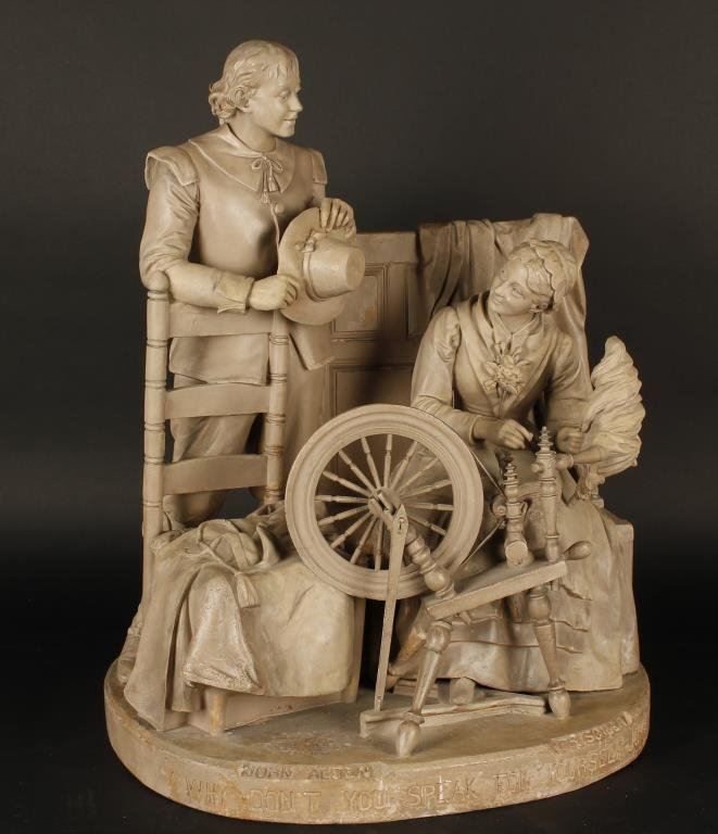 19th Century terra cotta statue by John Rodgers, N.Y. entitled “why don’t you Speak for Yourself John”; portrays John Alden and Pricilla in Colonial dress; approximately 32.5” in height by 16”; dated and patent marked 1885 on reverse; near fine condition and rarely encountered. Est.: $350-$700.
