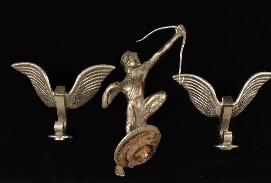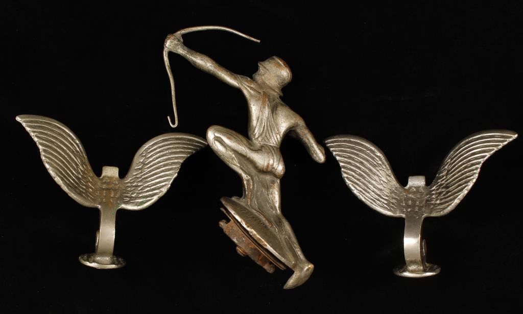 Collectible automobile ornament lot including a Pierce Arrow hood ornament (factory) missing the arrow and bow is broken at top, ca late 1920’s; also 2 Winged J Mascot hood ornaments, ca 1920’s. Est.: $250-$500.