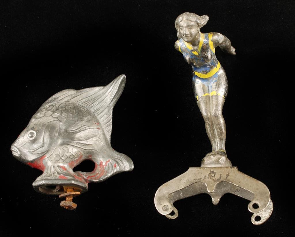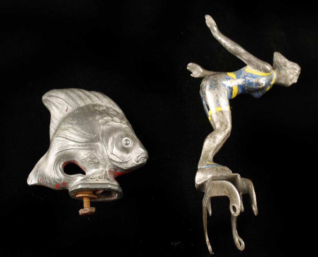 Lot of 2 vintage hood ornaments including a small size diving woman with traces of paint, ca 1920’s and a small flounder fish ornament with traces of red paint, ca 1910-20’s. Est.: $200-$400.