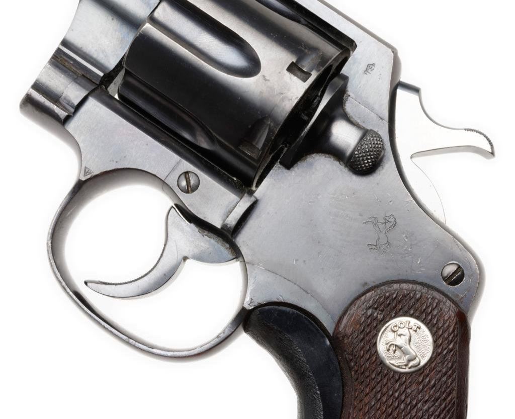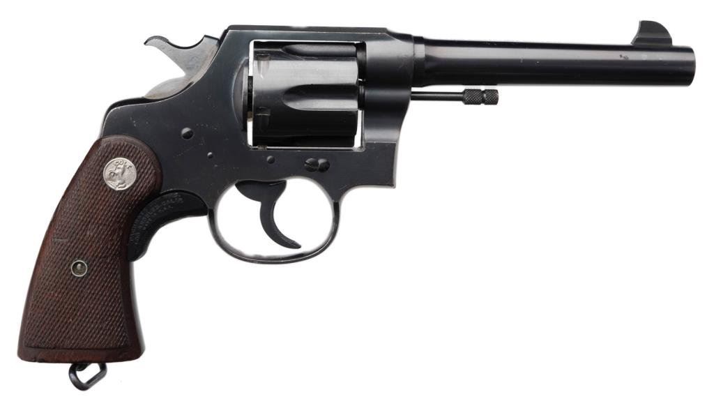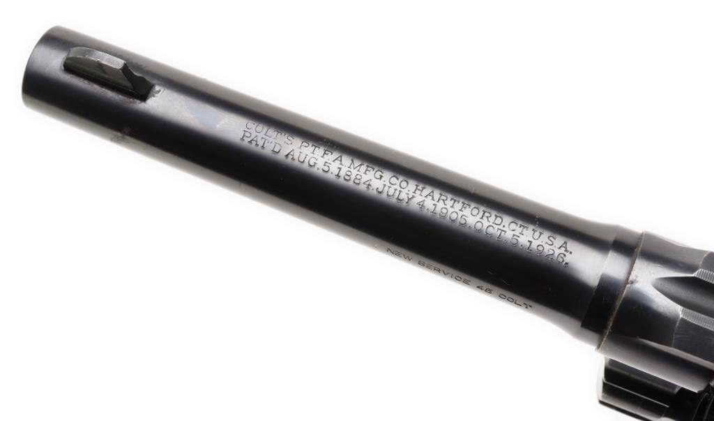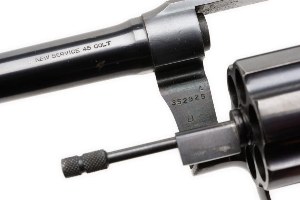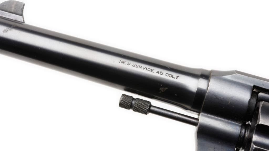 **Colt New Service DA revolver, .45 Colt caliber, 5.5” barrel, S/N 352925, blued finish, checkered wood medallion grips with lanyard ring and “W” inside crown proof on top left side of frame; added trigger shoe; overall fine condition with majority of original blue, crisp overall. Est.: $600-$1,200.