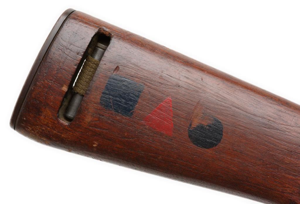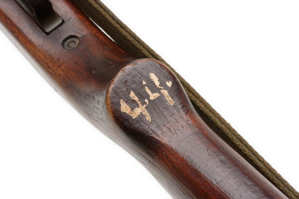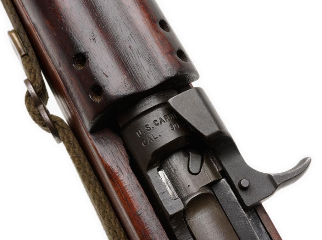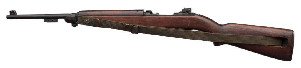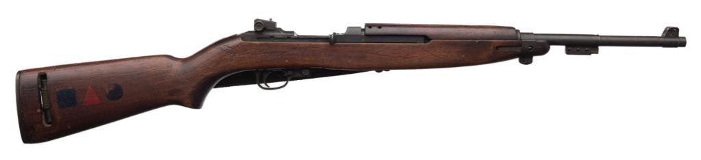 **U.S. M-1 semi-automatic carbine by Inland, .30 caliber, 18” barrel, S/N 160030, military finish, no magazine, wood stock, woven sling, in overall very good condition with some old scratches and dings to stock plus 3 old painted emblems on the right side of the butt stock. Est.: $600-$1,000.