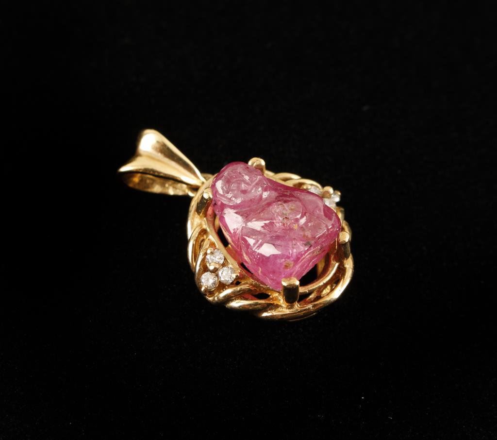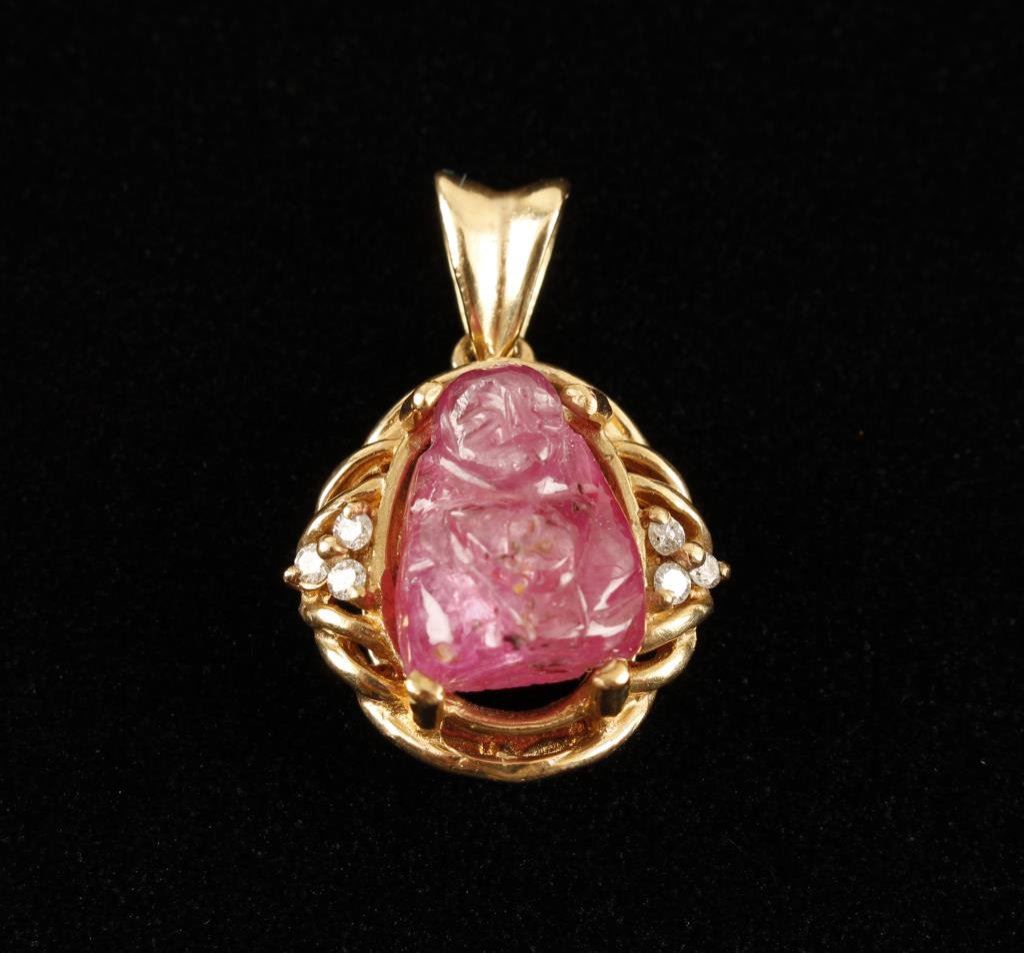 Lot 1606 One exquisitely carved Buddha in ruby set in a 14k yellow gold pendant wit