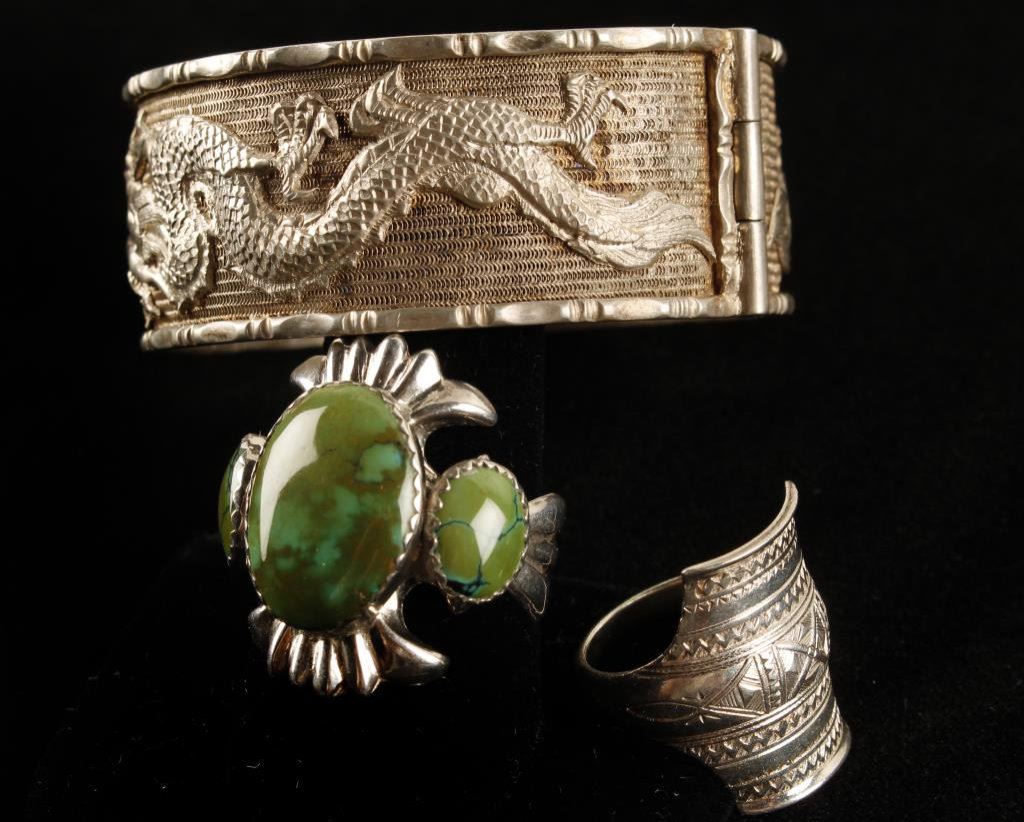 Misc. silver jewelry 1 sterling silver ring set with 3 malachite cabs. One silver ring with Indian motif. and a intricate Chinese silver bangle bracelet with dragon motif. Est:$250-300