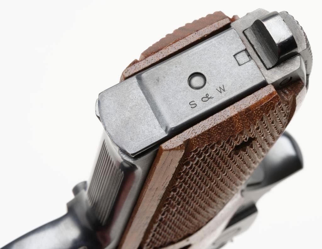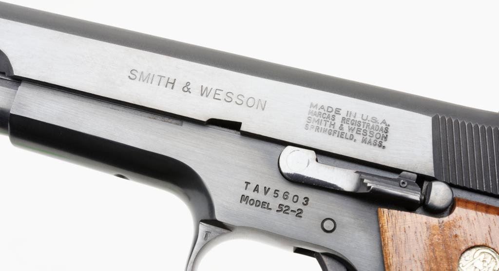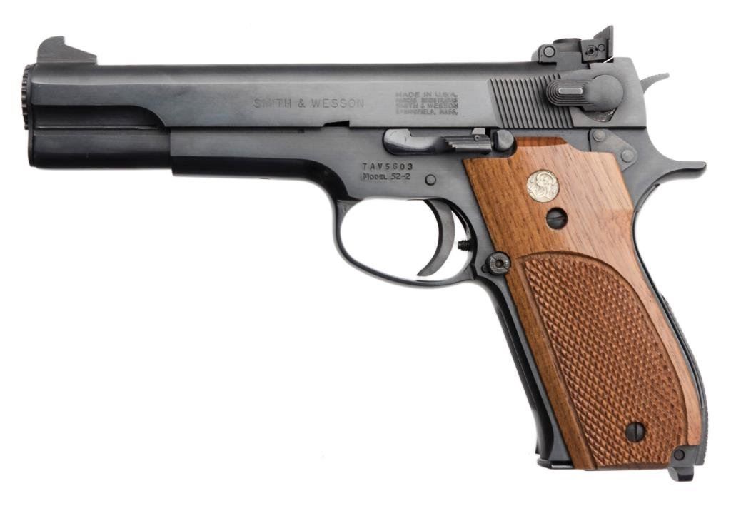 *Smith & Wesson Model 52-2 semi-automatic pistol, .38 Special Mid-range caliber, 5” barrel, S/N TAV5603, blued finish, checkered wood medallion grips in overall excellent condition. Est.: $700-$1,400.