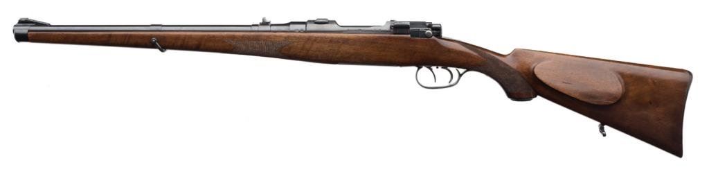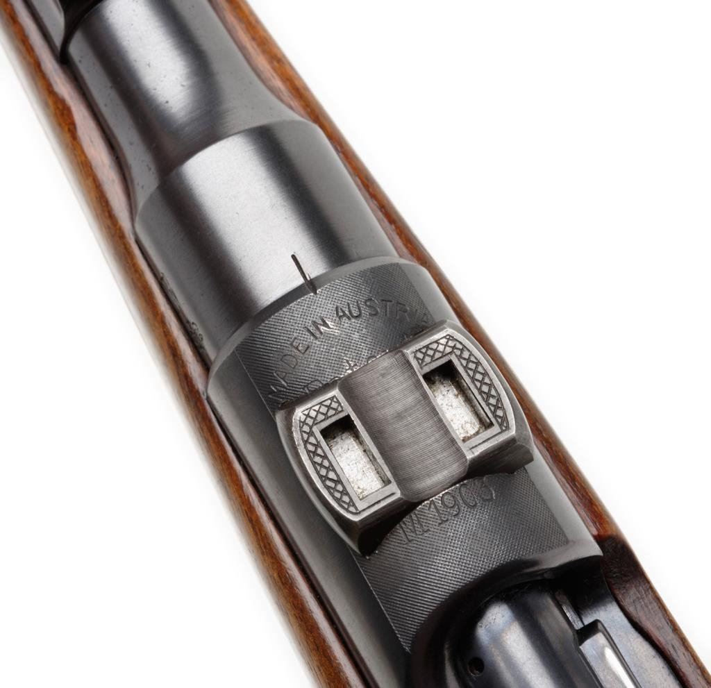 Early Mannlicher carbine in 6.5mm caliber, SN: 24139. The metal shows 95% plus original blue. The stocks are very good with minor scratches and use. The bore is bright. Sharp and crisp. Double triggers with typical claw mount bases. Est.:$1750-$3500