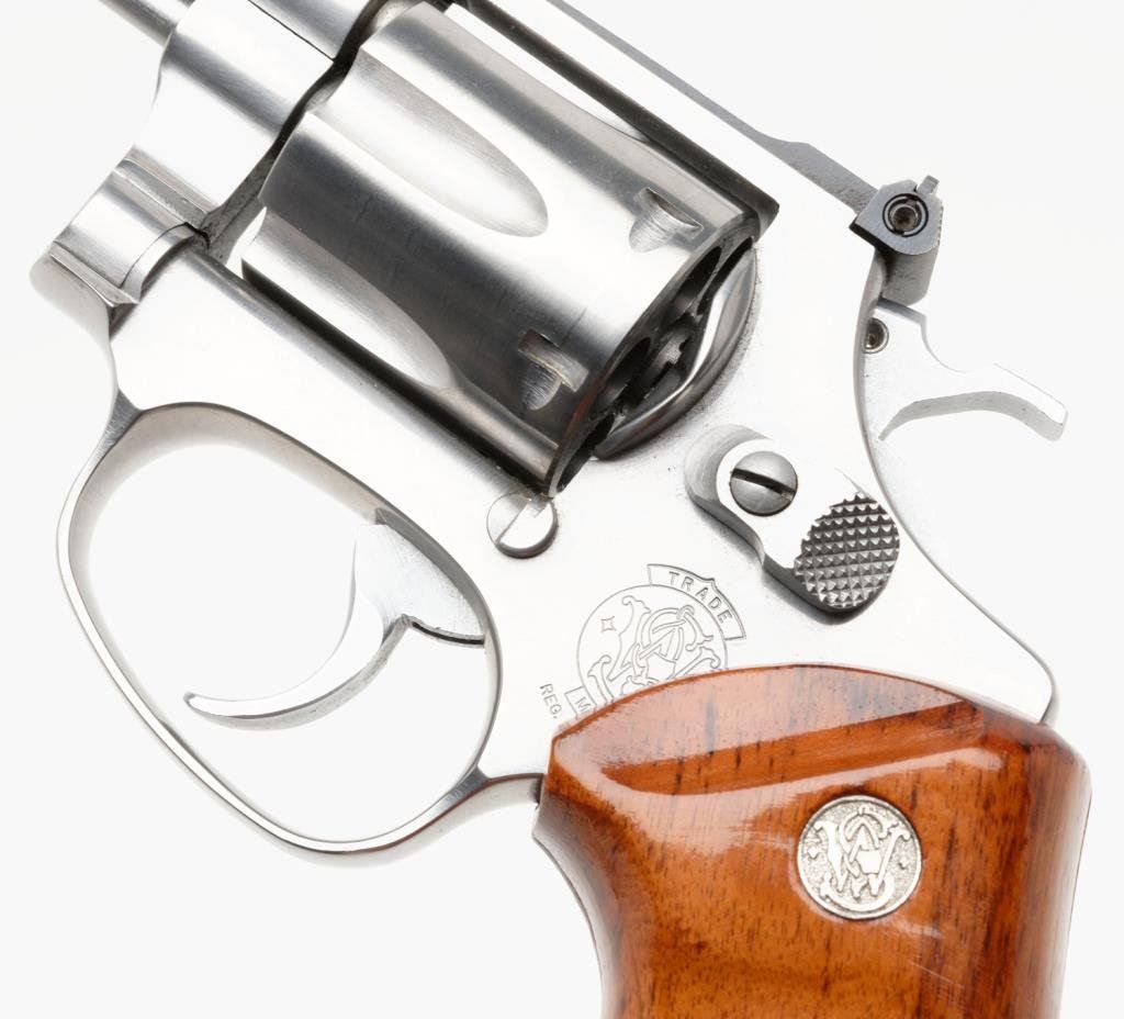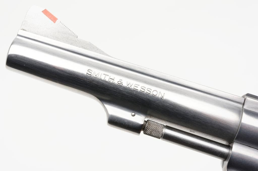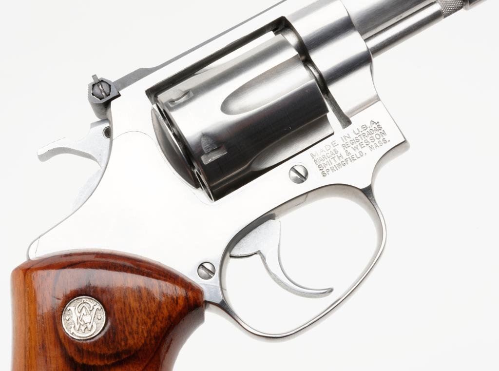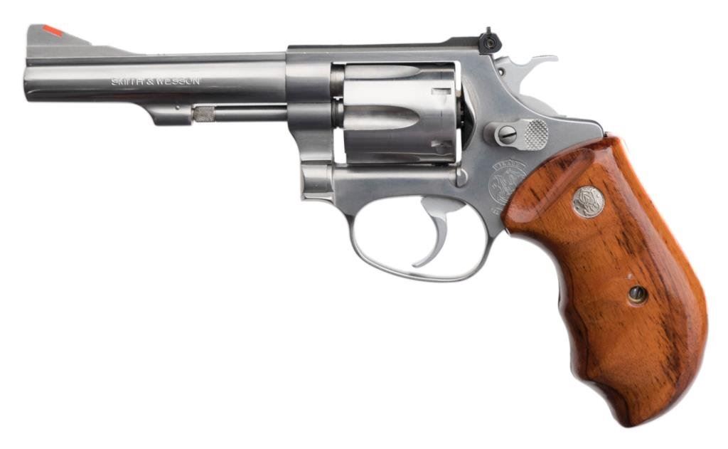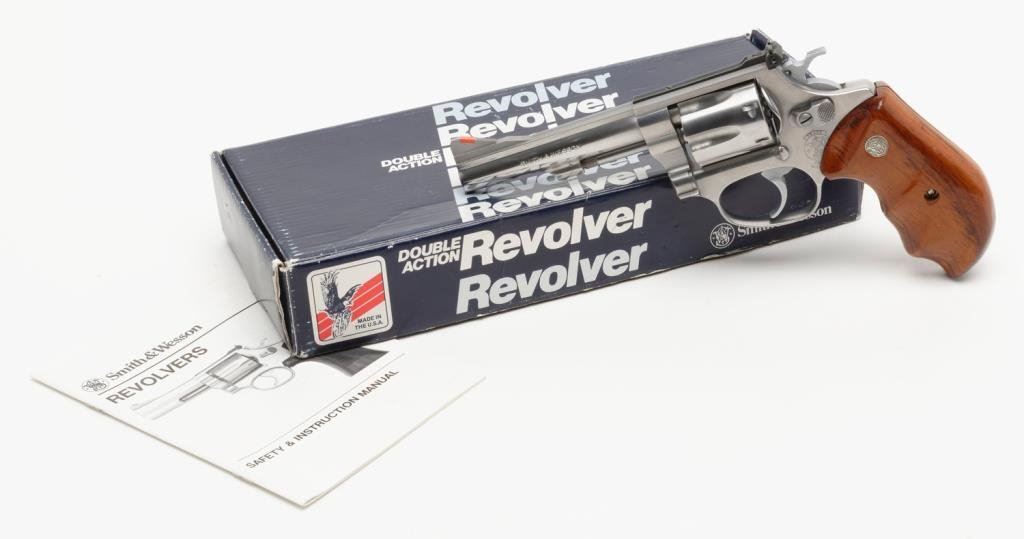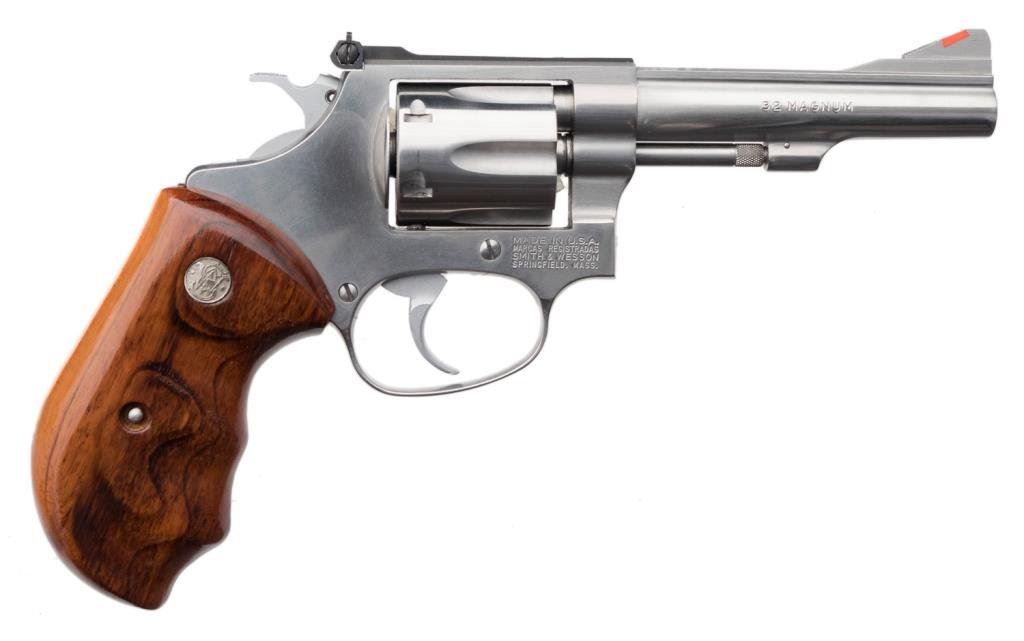 *Smith & Wesson Model 631 DA revolver, .32 Magnum caliber, 4” barrel, S/N BEZ2943, stainless, finger groove S&W medallion wood grips in overall excellent condition with factory cardboard box, end label numbered to gun and with instructions. Est.: $1,200-$1,600.