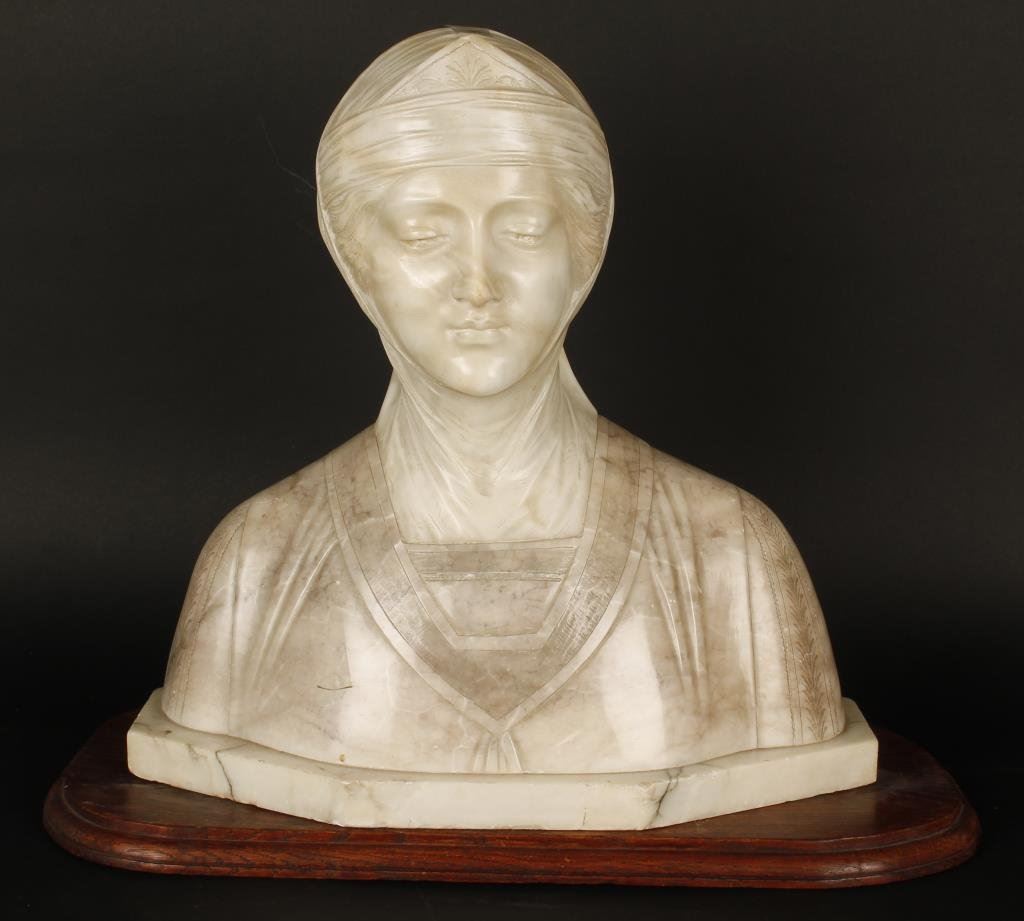 Marble bust signed on reverse “Prof. E. M. Sorry”; made in Italy; approximately 15.5” in height by 16” wide. Est.: $500-$1,000.
