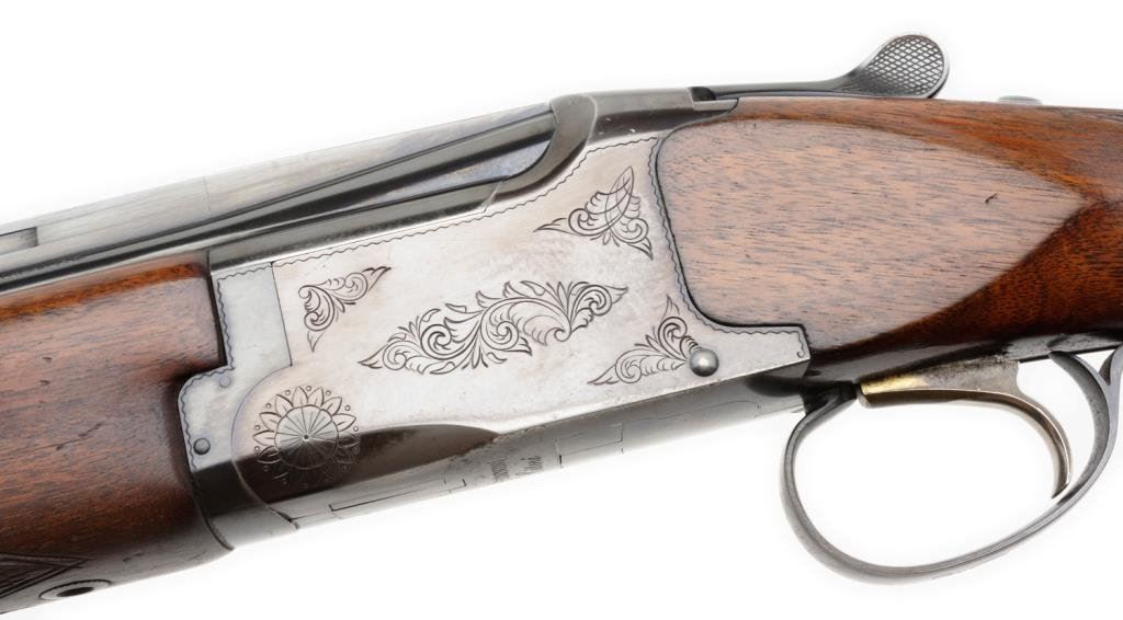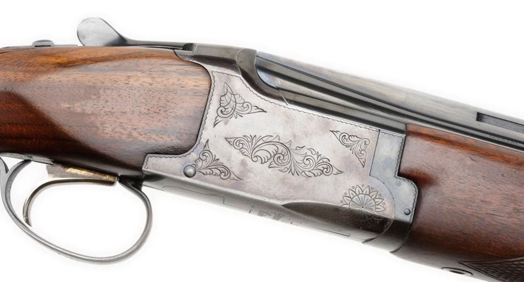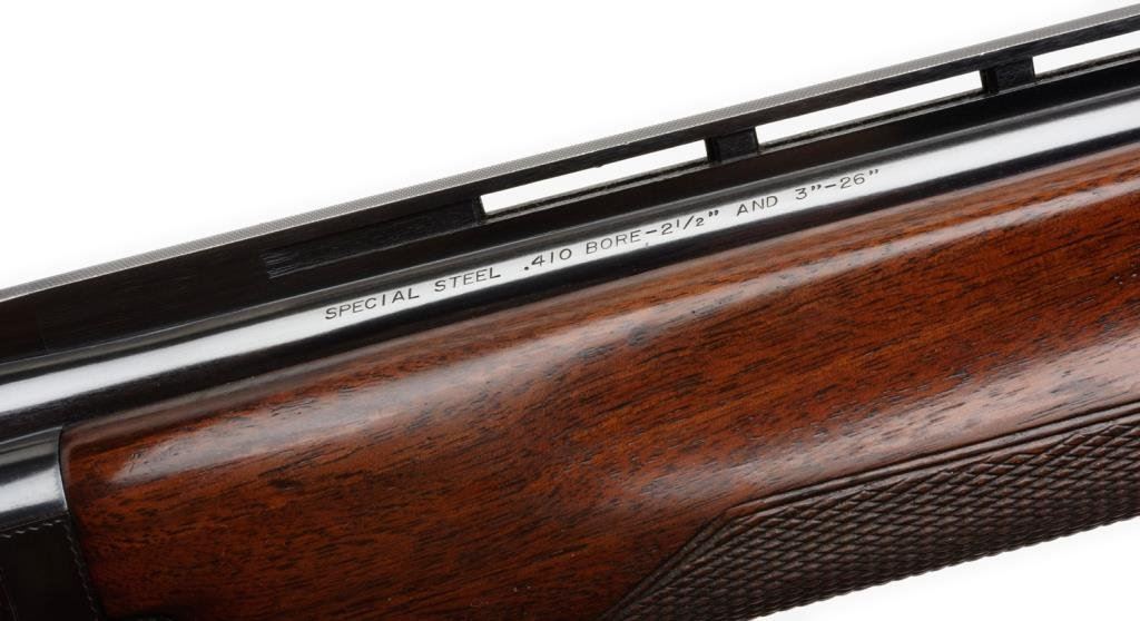 *Browning Citori Model over/under shotgun, .410 gauge, 26” ventilated rib barrels, S/N 13390PZ183, blued finish, checkered wood stocks in overall very good to fine condition with majority of original finish, fine bores, crisp actions and very good wood with added White Line hard rubber butt pad. Est.: $400-$800.
