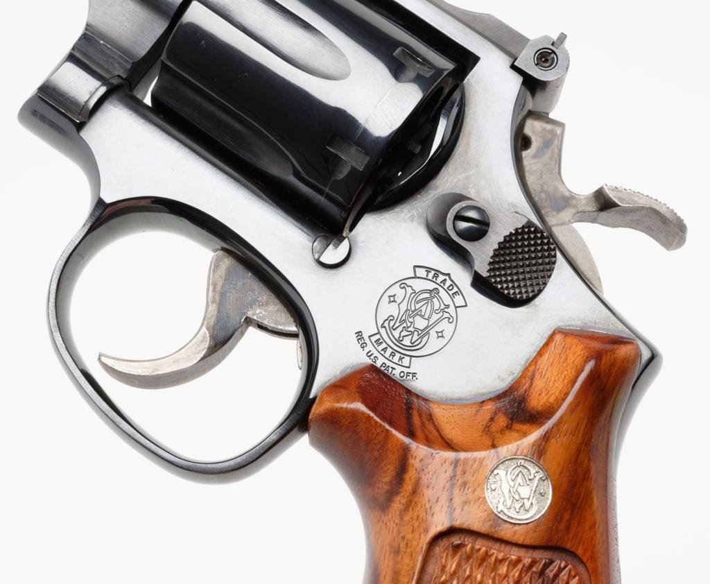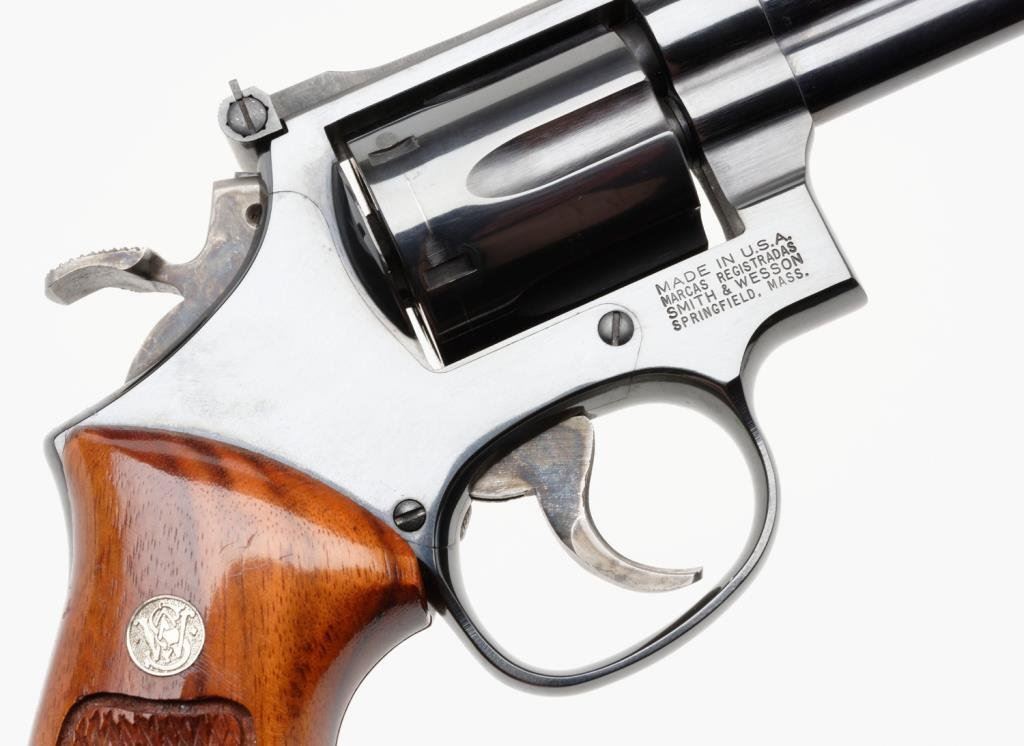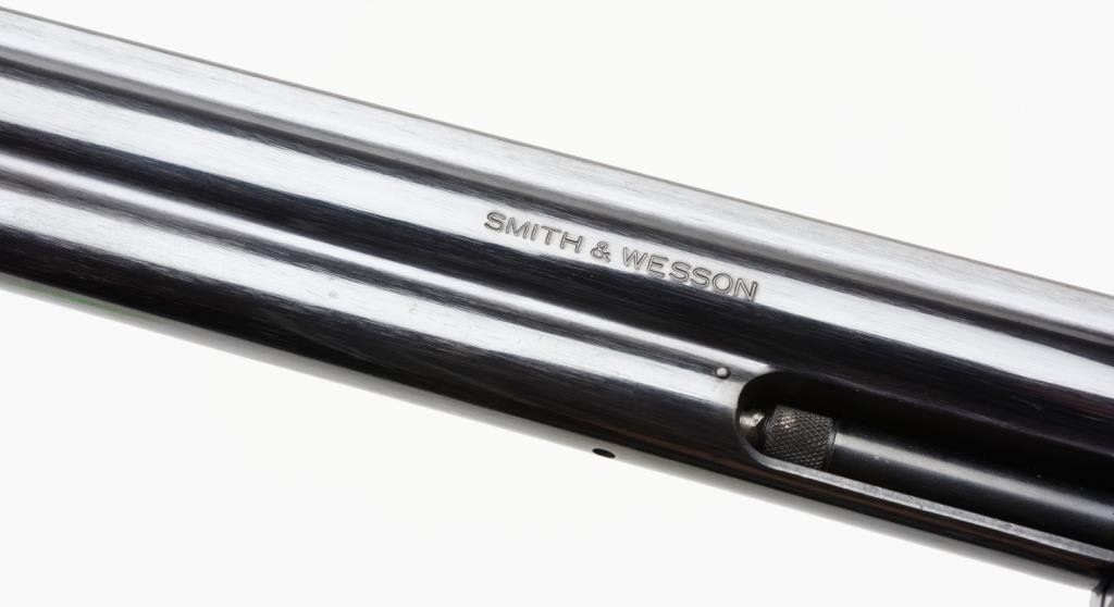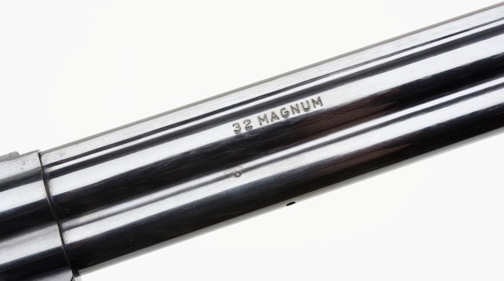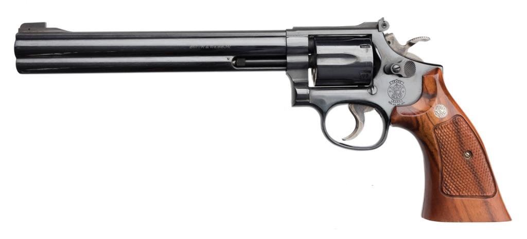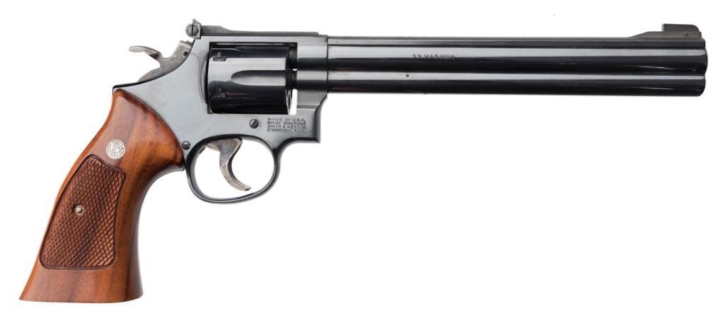 * Smith and Wesson Model 16-4 revolver, .32 Magnum cal., serial #PET8939. The pistol is in excellent overall condition with an 8 3/8” barrel with a ramp front and adjustable rear sights. The pistol shows little, if any use, retaining nearly all of its blued finish with the cylinder showing a faint drag line. The hammer and trigger show significant case coloring still present. The checkered gold medallion wood grips are in excellent condition with sharp checkering and only the slightest of handling marks. It would be hard to improve on this one. Est.: $600-$1,200.