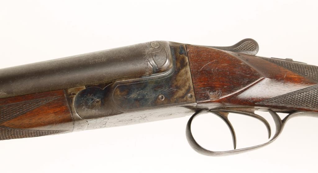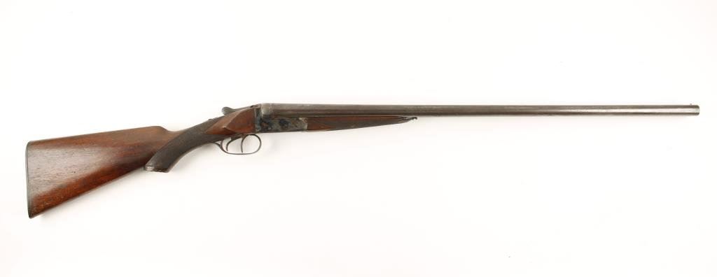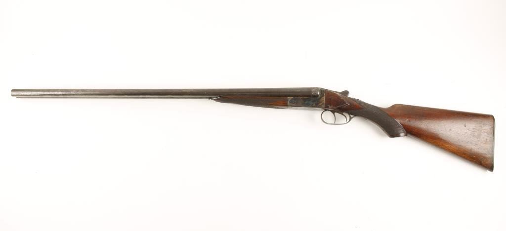 Belgian-made SxS hammerless shotgun, 16 gauge, , double triggers, 27-3/4” barrels marked “Nitro” but displaying damascene pattern, both barrels are IC choked, case hardened receiver, checkered wood stocks with horn butt plate, length of pull is 14-3/4”, #42338. This gun is in overall good to very good condition showing a dark patina on barrels, considerable original case colors on the receiver, overall good bores, crisp actions and good + wood stocks with scattered old mars and scratches from storage and carry; some worming to horn butt plate. Est.: $350-$700. NOTE: NO EJECTORS.