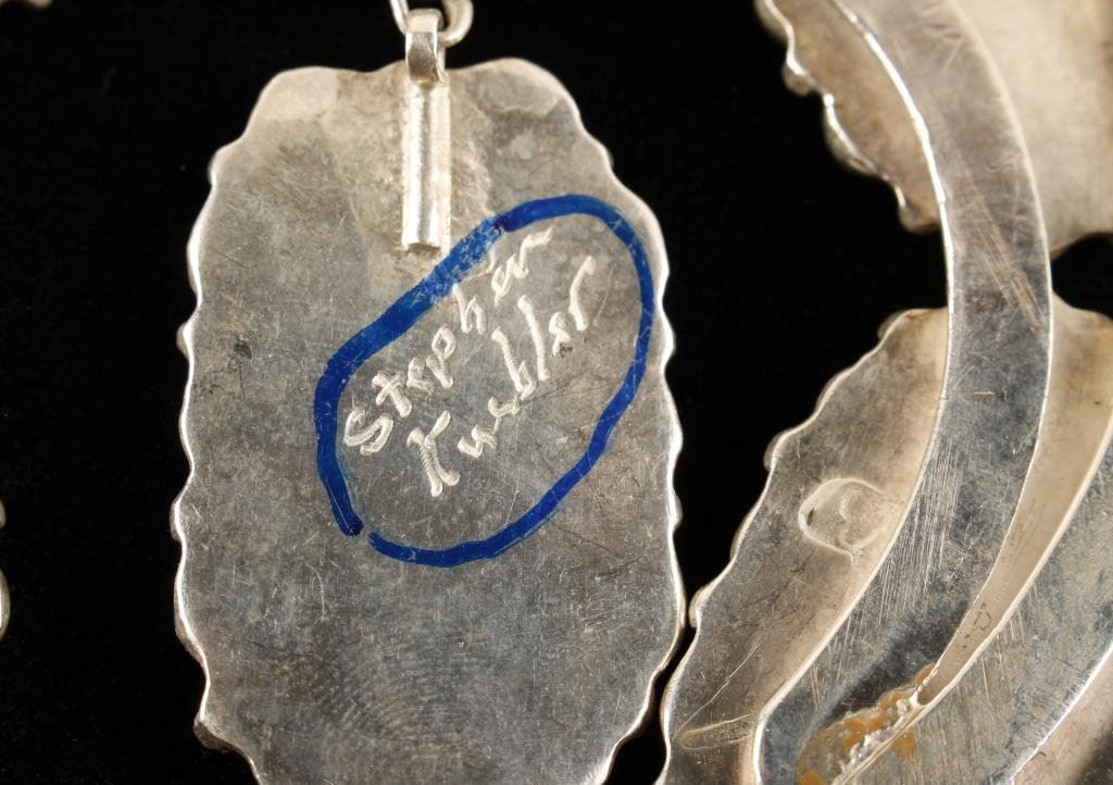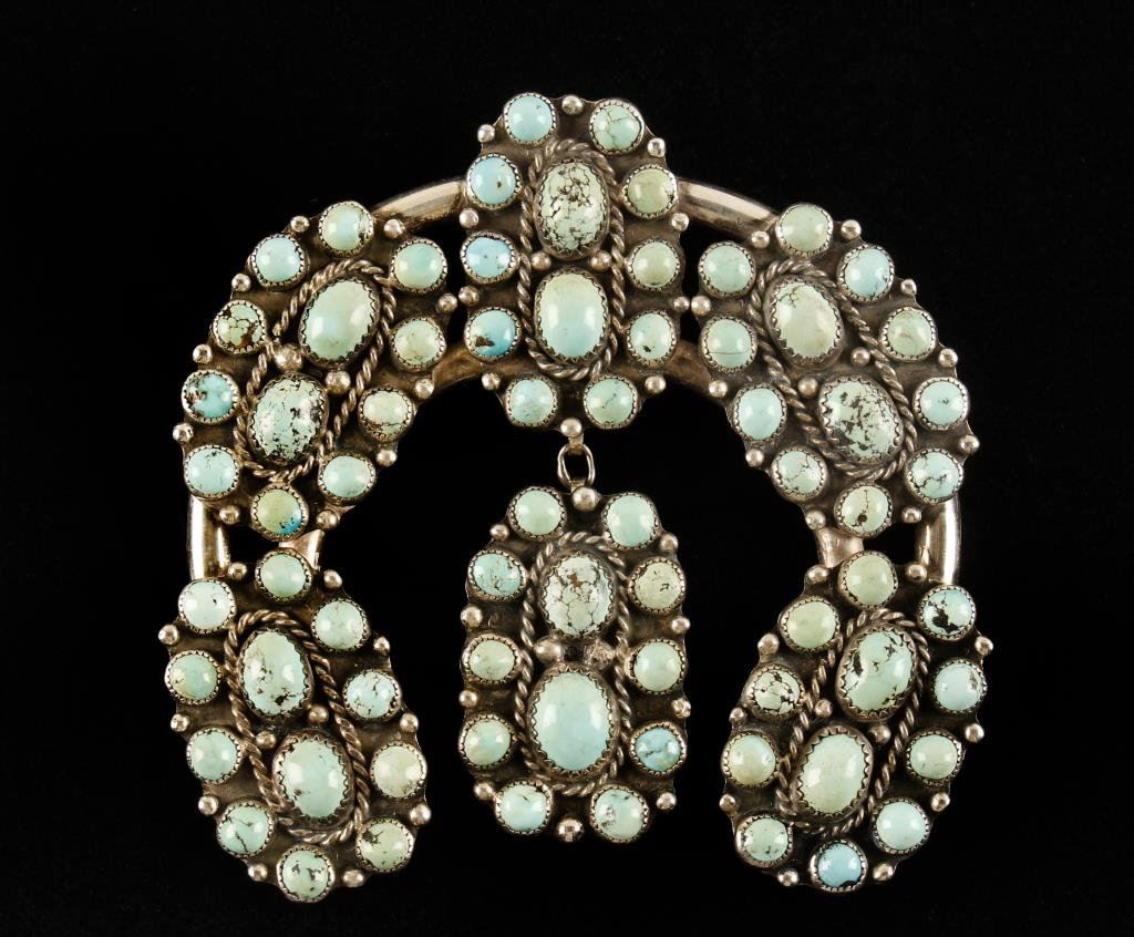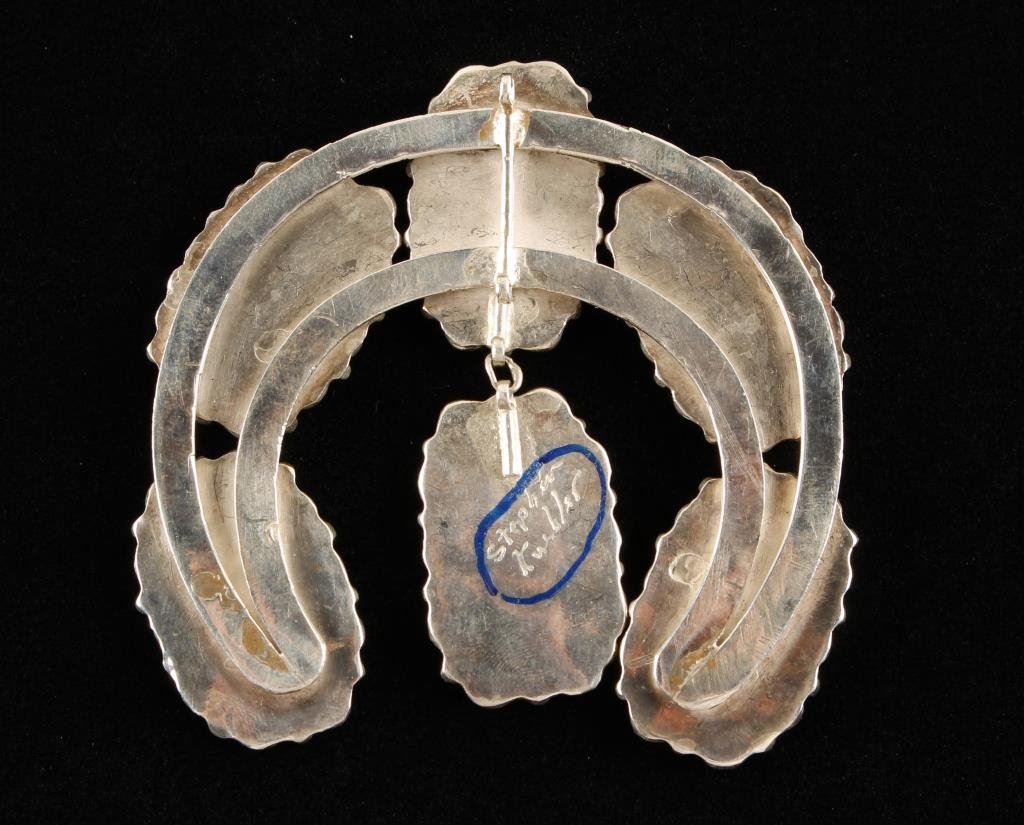 One Stephen Kushler signed horse shoe designed pendant set with 72 cabochon turquoise . wt 95 grams. Est:$500-600